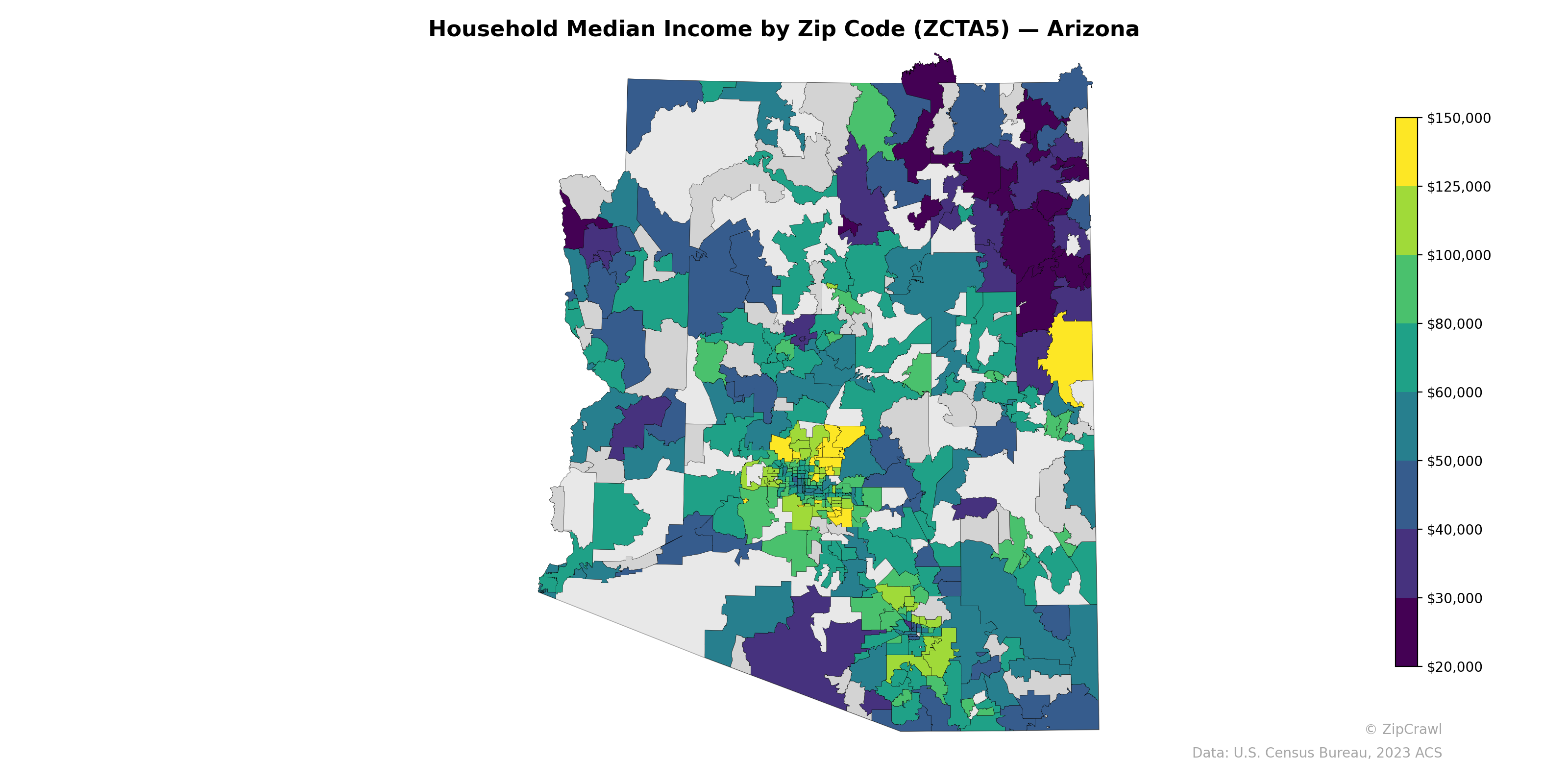 The Phoenix metropolitan area exhibits stark income stratification, with high-income zip codes (exceeding $125,000) concentrated in the Scottsdale and north Phoenix corridor, while adjacent areas to the south and west fall below $40,000, creating one of the sharpest intra-metro income gradients in the state. Rural and tribal areas across the northeastern portion of the state consistently register among the lowest median incomes, predominantly in the $20,000–$30,000 range, contrasting with moderate-income zones ($60,000–$80,000) along the I-17 corridor and in the Flagstaff and Prescott regions. A notable high-income outlier appears on the eastern border near the Greenlee/Graham County area, while southern Arizona around Tucson displays a more compressed income distribution than metro Phoenix.