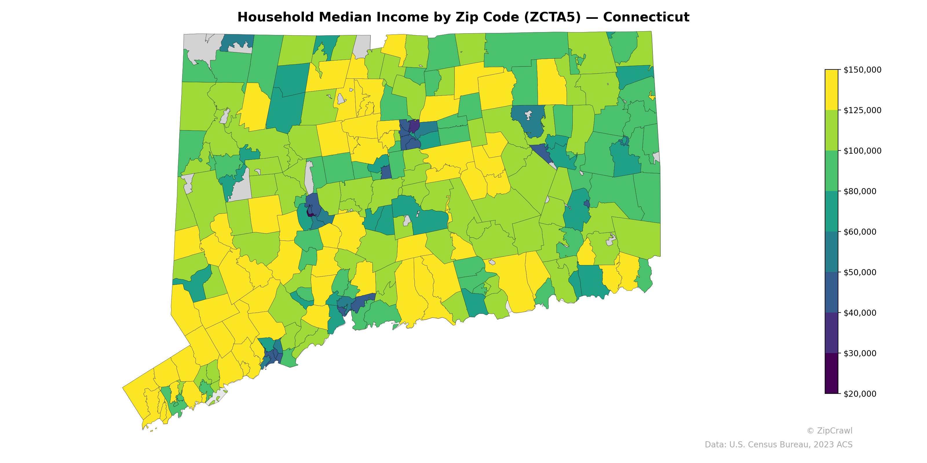 The highest household median incomes, exceeding $150,000, concentrate in the southwestern Fairfield County corridor—particularly in zip codes corresponding to Greenwich, Darien, and New Canaan—while a secondary high-income cluster appears in parts of the Hartford suburbs and the Farmington Valley. Sharp income contrasts are evident in urban centers, where zip codes in Bridgeport, New Haven, Hartford, and Waterbury drop below $40,000, often immediately adjacent to affluent suburban zip codes, creating some of the steepest income gradients in the state. The rural northeastern and northwestern corners of the state generally fall in the moderate $80,000–$100,000 range, reflecting a more economically homogeneous landscape compared to the highly stratified coastal and central corridors.