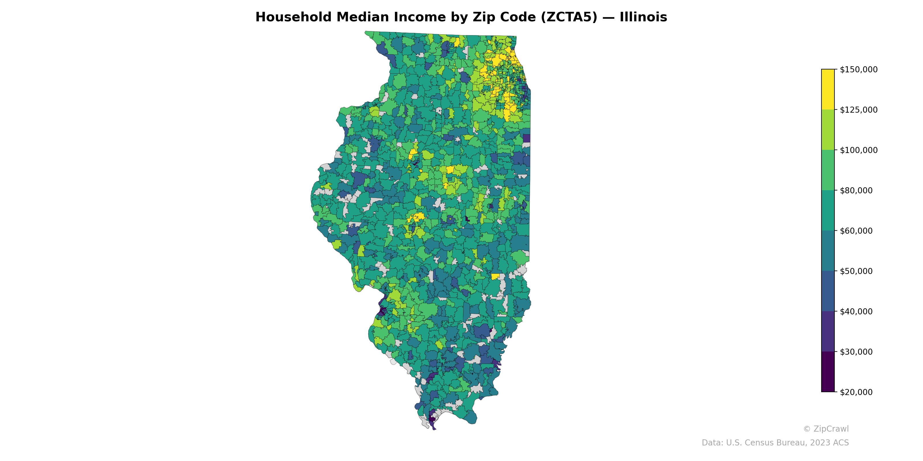 The Chicago suburban collar counties—particularly the North Shore and western DuPage County—display the highest median household incomes in the state, with numerous zip codes exceeding $125,000, while zip codes within Chicago's South and West sides show stark contrasts, dipping below $30,000 in some areas. Central Illinois exhibits a patchwork pattern where zip codes anchored by mid-sized cities like Peoria, Springfield, and Champaign tend toward moderate incomes ($50,000–$70,000), surrounded by rural areas with generally lower earnings. Southern Illinois consistently registers among the lowest median incomes statewide, with concentrations of deep purple zip codes below $30,000 clustered in the Cairo region and along the southeastern border counties.