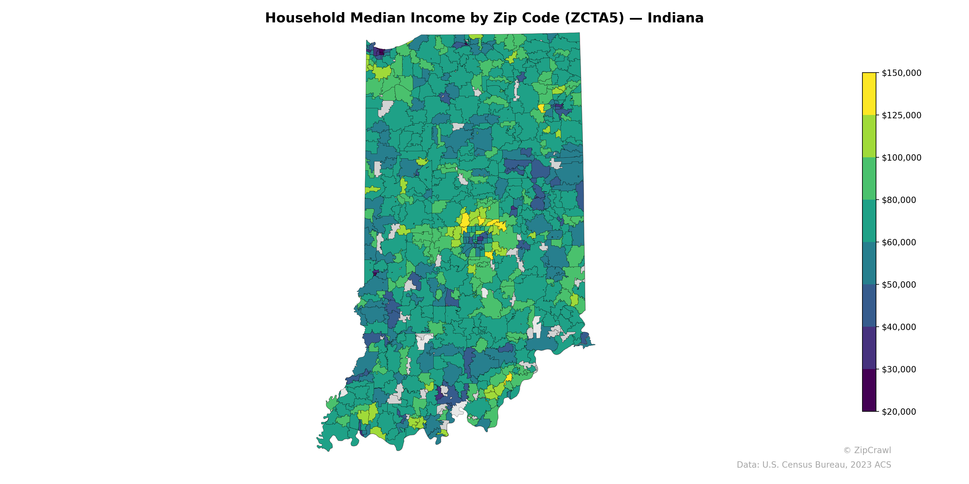 The Indianapolis metropolitan area exhibits a pronounced income gradient, with affluent suburban zip codes north of the city (likely Hamilton County communities such as Carmel, Fishers, and Zionsville) reaching $125,000–$150,000, while central Indianapolis zip codes fall sharply to $20,000–$40,000, creating one of the state's starkest intra-regional contrasts. Southern Indiana, particularly the rural stretch from the Terre Haute area through the unglaciated hill country toward the Kentucky border, consistently registers lower median incomes in the $30,000–$50,000 range, with scattered pockets of deeper poverty. Northern Indiana displays a more heterogeneous pattern, where moderate-income manufacturing and agricultural communities in the $50,000–$80,000 range are interspersed with lower-income urban cores around cities like South Bend, Fort Wayne, and Gary.