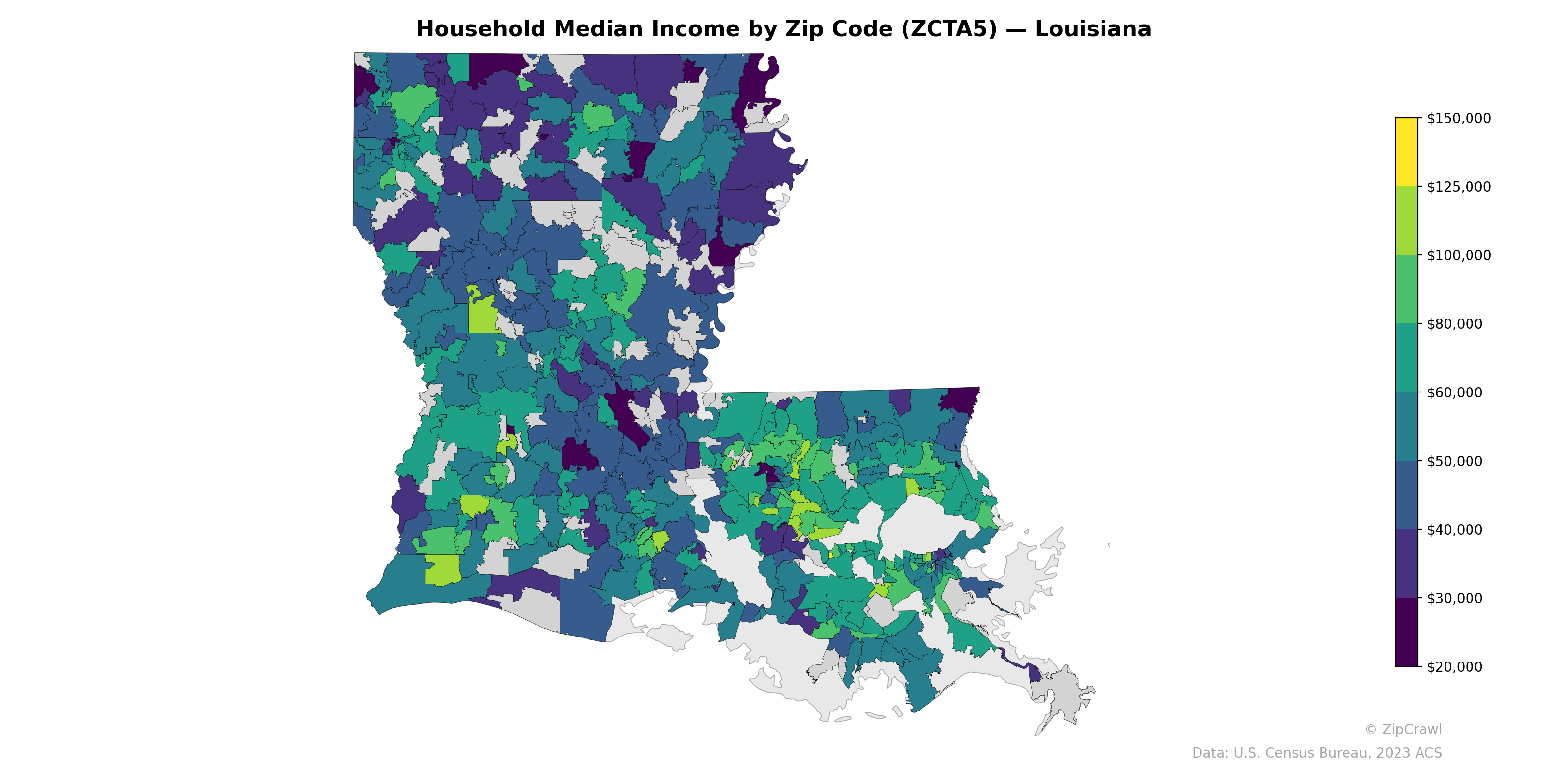 Higher-income zip codes cluster prominently in the northwestern corner around the Shreveport-Bossier City suburbs and in the southwestern Acadiana region near Lafayette and Lake Charles, where several zones exceed $80,000–$100,000. The Greater New Orleans metropolitan area in the southeast displays stark intra-urban inequality, with affluent suburban zip codes adjacent to some of the state's lowest-income areas falling below $25,000. Central and northeastern Louisiana, particularly the Mississippi Delta region, consistently registers among the lowest median incomes statewide, reflecting persistent rural poverty concentrated in the state's historically underinvested Black Belt communities.