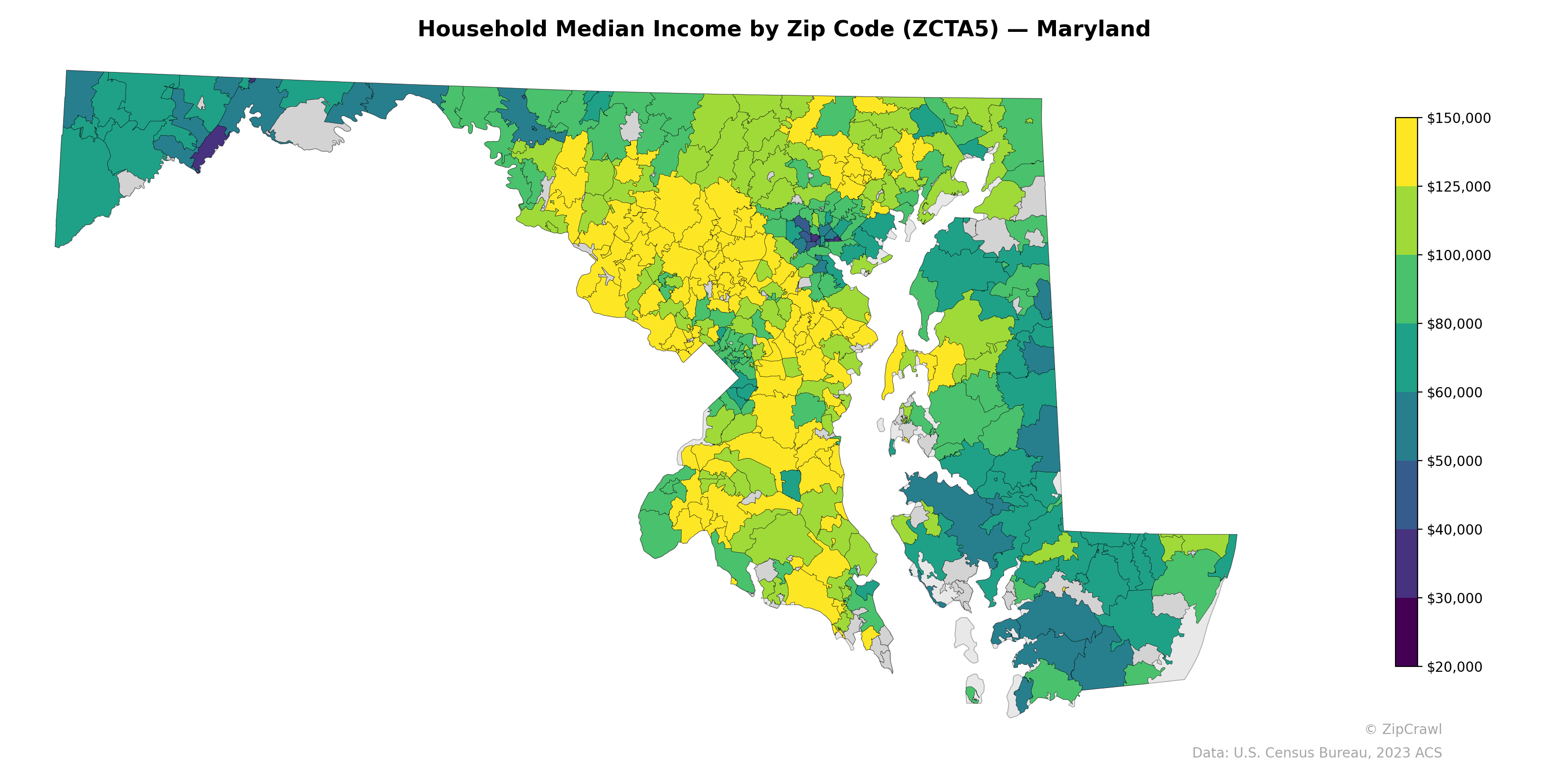 The central Maryland corridor spanning Montgomery, Howard, and portions of Anne Arundel and Prince George's counties forms a dominant high-income cluster, with numerous zip codes exceeding $125,000 in household median income. The Eastern Shore and Southern Maryland's lower peninsula display markedly lower median incomes, generally falling in the $40,000–$60,000 range, while the westernmost panhandle of Garrett and Allegany counties similarly trends toward lower income levels. A sharp contrast is visible within the Baltimore metropolitan area, where affluent suburban zip codes in Baltimore County sit adjacent to significantly lower-income zip codes in Baltimore City proper.