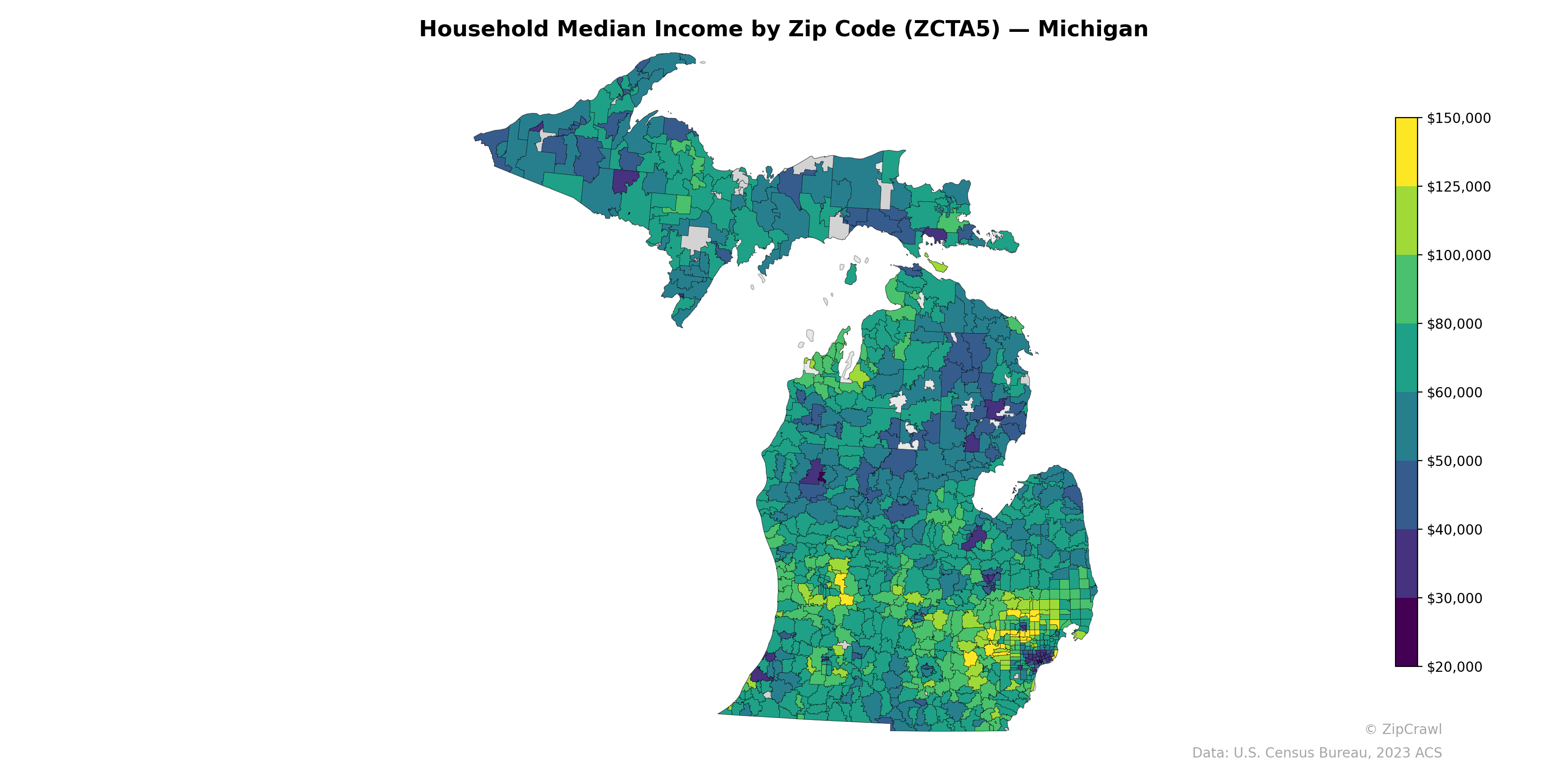 The Detroit metropolitan area exhibits the starkest income contrasts in the state, with zip codes in Oakland County's northern suburbs reaching above $125,000 while adjacent areas within the City of Detroit fall below $30,000—among the lowest in Michigan. Wealthy suburban clusters also appear along the western lakeshore near Grand Rapids and Traverse City, while much of the Upper Peninsula and the northern Lower Peninsula generally falls in the $40,000–$60,000 range, reflecting the economic challenges of Michigan's more rural and sparsely populated regions. Mid-Michigan's central corridor, including areas around Lansing and the Thumb region, trends toward moderate median incomes in the $50,000–$70,000 range, forming a broad middle band between the extremes of metro Detroit.