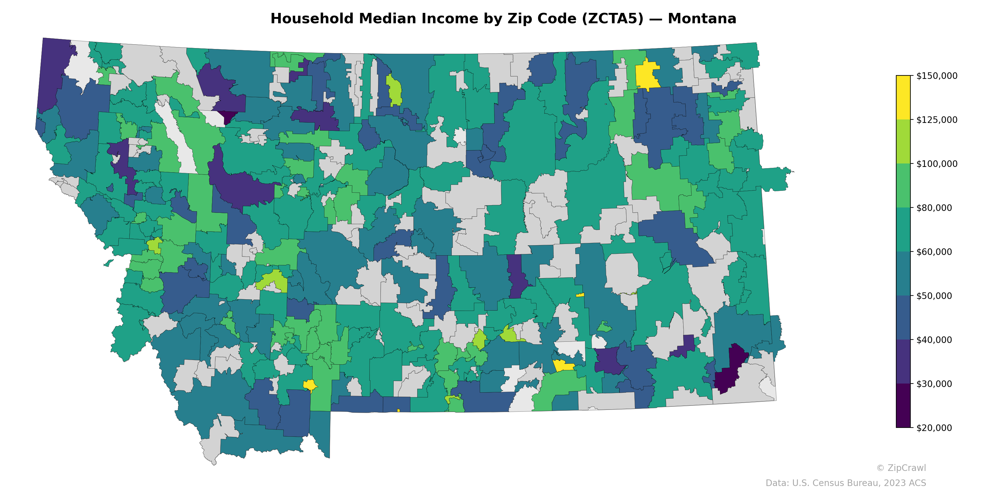 Western Montana's mountain communities, particularly in the Flathead Valley and areas surrounding Bozeman and Big Sky, display the highest median household incomes, with several zip codes exceeding $100,000 and at least one reaching near $150,000 in the northeast quadrant. In stark contrast, tribal reservation areas—most notably the Crow and Northern Cheyenne reservations in the southeast—register among the lowest incomes in the state, falling below $30,000. Central and eastern Montana present a patchwork of moderate incomes generally ranging from $40,000 to $70,000, interspersed with numerous gray (no-data) zones reflecting the region's sparse population and large, unpopulated zip code areas.