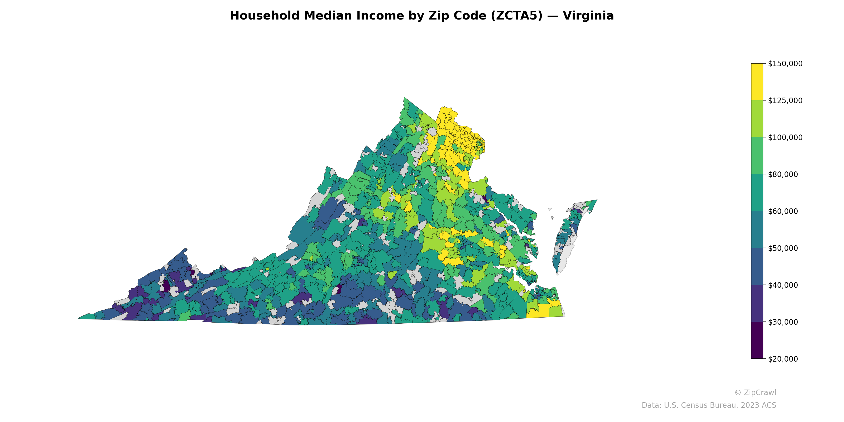 Northern Virginia zip codes, particularly in the Fairfax, Loudoun, and Prince William County corridor, display the highest household median incomes statewide, with numerous ZCTAs exceeding $125,000—consistent with proximity to the federal employment and contracting hub of Washington, D.C. A stark contrast emerges in the southwestern Appalachian region and parts of Southside Virginia, where median incomes frequently fall below $40,000, reflecting persistent rural economic disparities. Mid-range incomes in the $50,000–$80,000 band dominate the Shenandoah Valley and the Richmond-to-Hampton Roads urban corridor, though pockets of deep poverty appear within urban cores such as those near Norfolk and Danville.