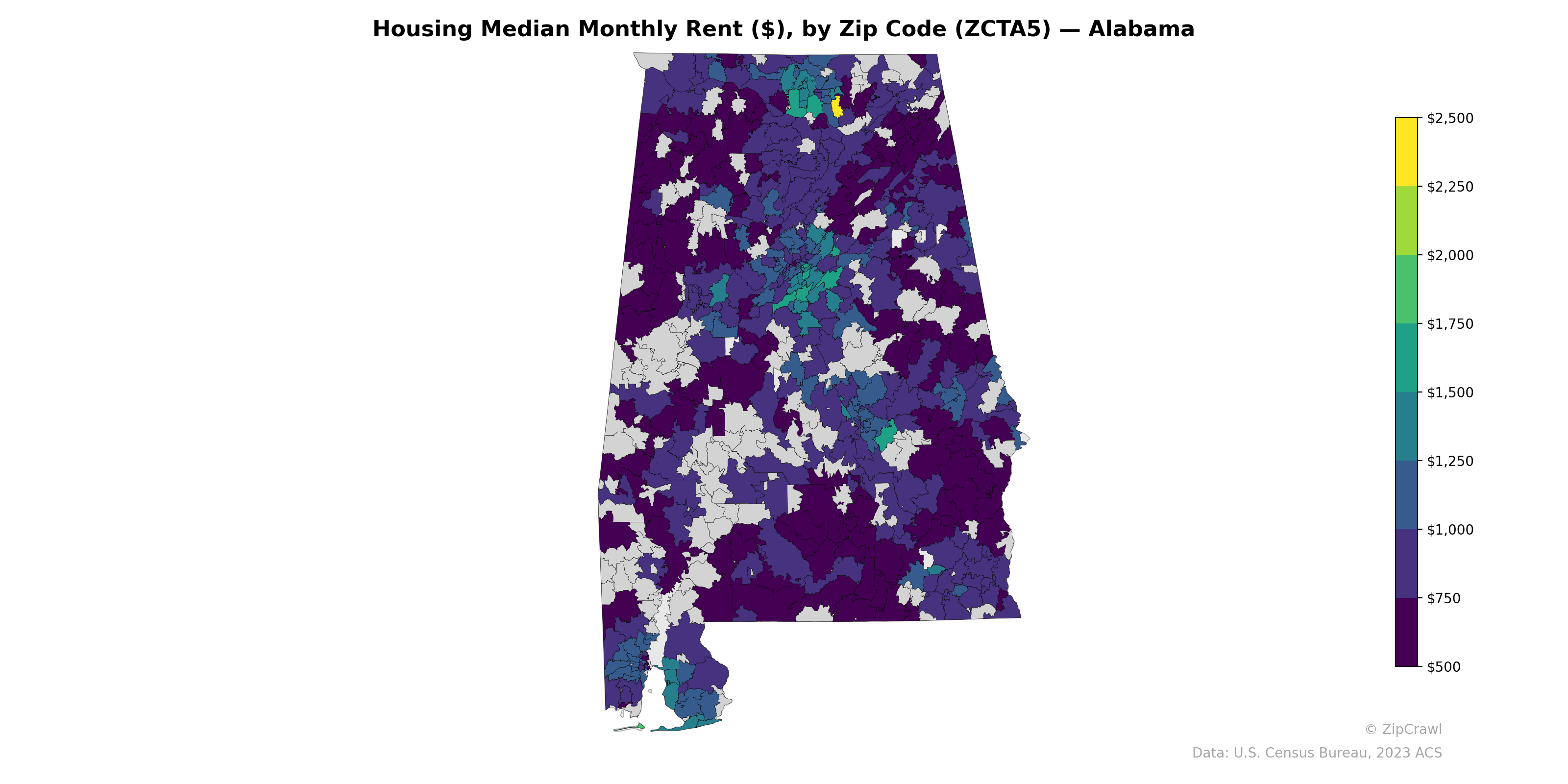 Median monthly rents across Alabama are predominantly in the $500–$750 range, with the darkest purple tones covering much of the rural Black Belt region through the south-central portion of the state and parts of western Alabama. Notable clusters of higher rents ($1,000–$1,500+) appear in the Birmingham metro area in the north-central part of the state, the Huntsville–Madison corridor in the northeast, and along the Gulf Coast near Mobile and Baldwin County, with one zip code near Huntsville reaching approximately $2,500. The contrast between urban cores and surrounding rural areas is stark, as many zip codes adjacent to these higher-rent clusters drop sharply back to sub-$750 levels.