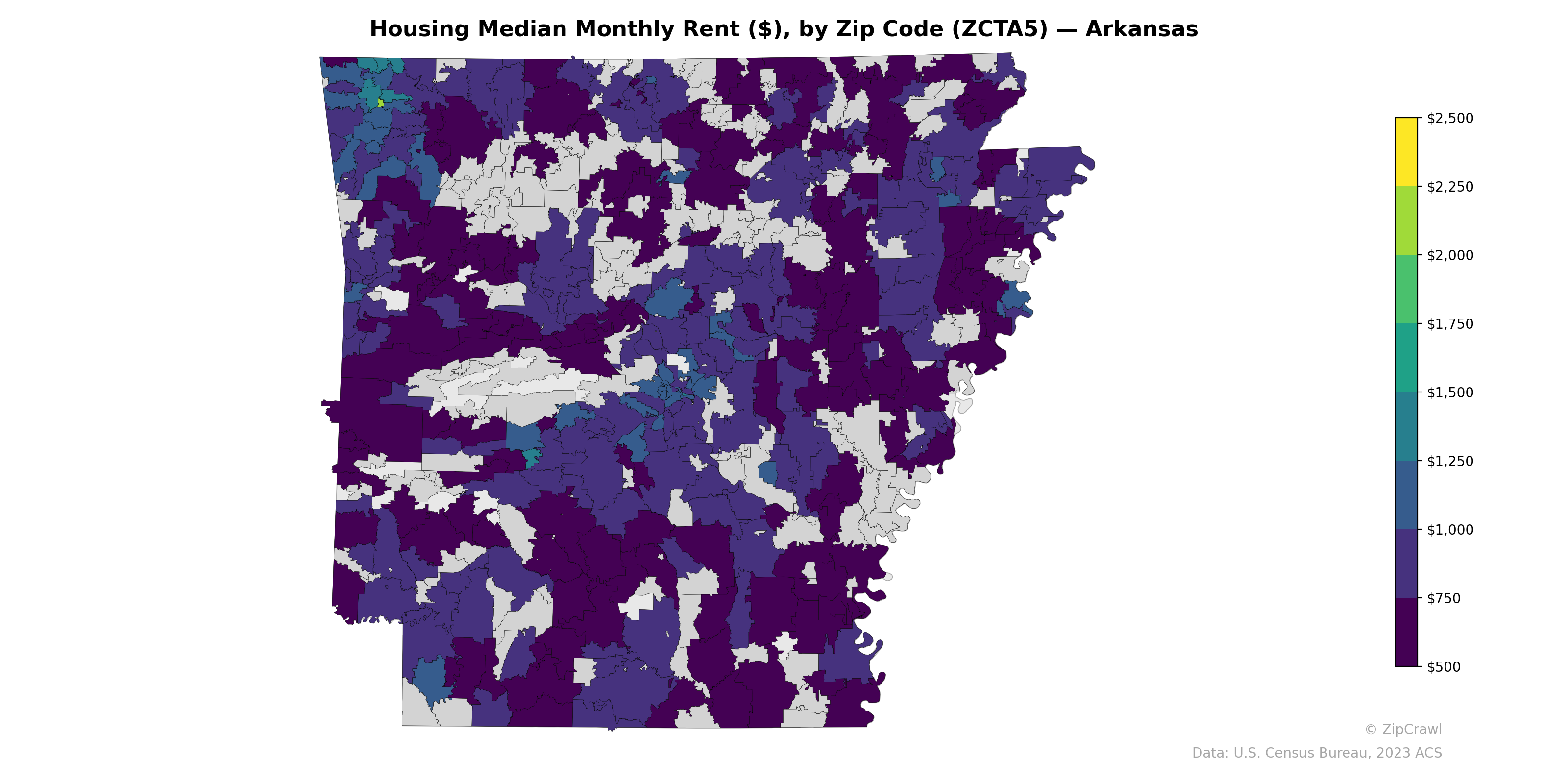 Northwest Arkansas zip codes—particularly in the Bentonville-Rogers-Fayetteville corridor—exhibit the highest median monthly rents in the state, with several areas exceeding $1,250 and at least one zip code reaching near $2,500, reflecting the economic influence of major employers like Walmart and the University of Arkansas. The central part of the state around Little Rock also displays moderately elevated rents compared to surrounding areas, though not reaching the peaks seen in the northwest. Much of southern and rural Arkansas remains firmly in the $500–$750 range, with extensive clusters of the lowest rent levels in the Delta region to the east and the Ouachita Mountains to the southwest, underscoring the persistent urban-rural economic divide across the state.
