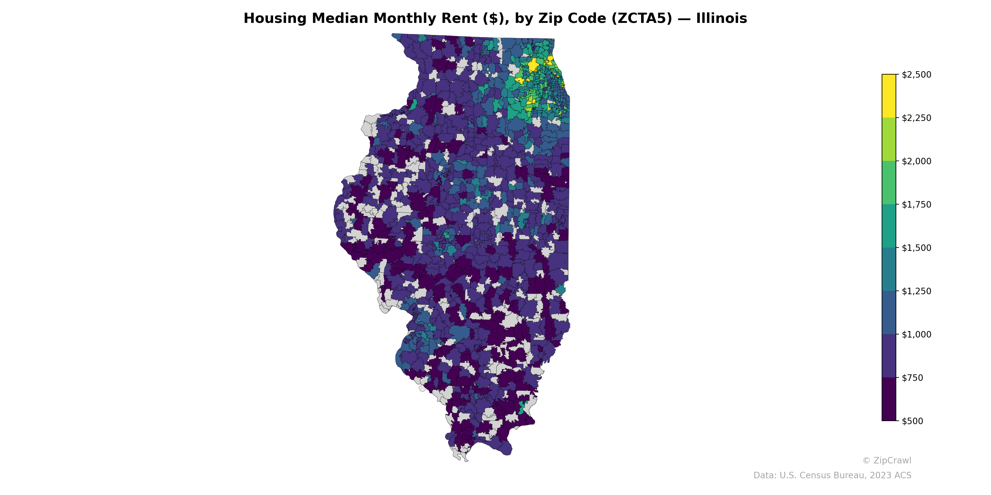 The Chicago metropolitan area in the northeastern corner of the state dominates the high end of the rent spectrum, with several zip codes exceeding $2,000–$2,500 per month, while surrounding suburban areas display a gradient stepping down through the $1,250–$1,750 range. Central and southern Illinois zip codes are predominantly in the $500–$750 range, with scattered pockets of moderately higher rents near university towns and regional centers such as Champaign-Urbana and Springfield. The starkest contrast exists between the affluent North Shore suburbs along Lake Michigan and the deeply rural southern third of the state, where median rents in some zip codes fall below $500.