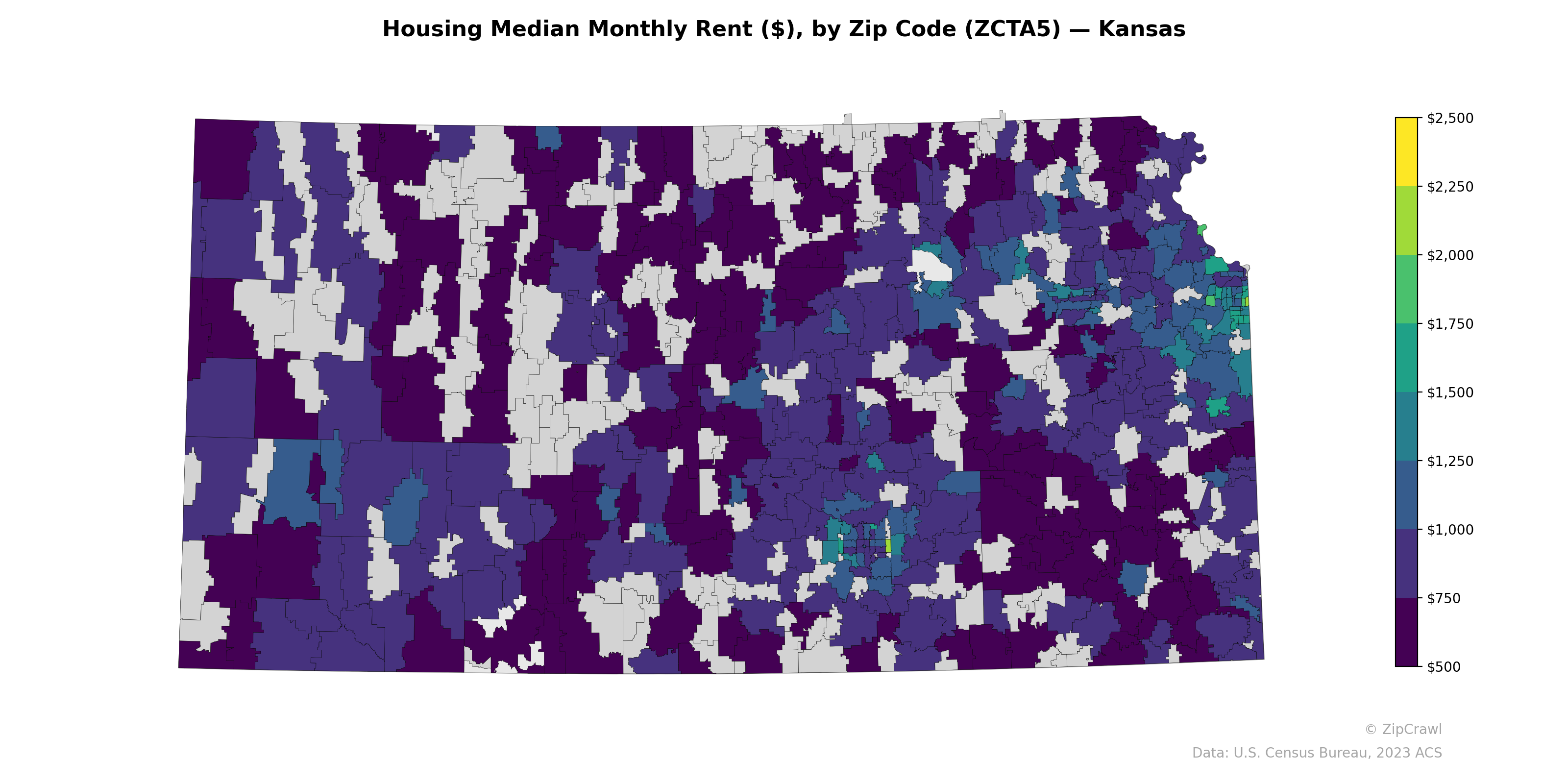 The highest median rents in Kansas concentrate in the Kansas City metropolitan area along the northeastern border, where several zip codes reach $1,750–$2,500, reflecting the suburban communities of Johnson and Wyandotte counties. A secondary rent cluster appears around the Wichita metro in south-central Kansas, with select zip codes reaching $1,000–$1,250, though surrounded by lower-rent rural areas. The vast western and central portions of the state are dominated by median rents below $750, with numerous gray (no-data) zip codes indicating sparse populations insufficient for reliable estimates.