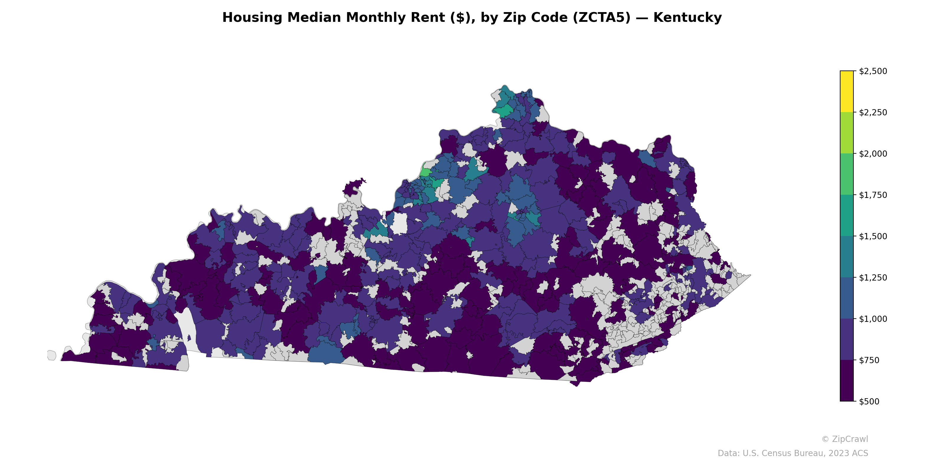 Northern Kentucky zip codes along the Cincinnati metro border exhibit the highest median rents in the state, with several areas exceeding $1,750, while the Louisville metro area and select Lexington-area zip codes form a secondary cluster of elevated rents ranging from $1,000 to $1,500. In stark contrast, the southeastern Appalachian region and much of south-central Kentucky consistently register median rents below $750, reflecting the state's sharpest urban-rural affordability divide. Scattered pockets of moderate rents ($900–$1,250) appear around Bowling Green and a few mid-state corridors, suggesting localized economic anchors in otherwise lower-rent territory.