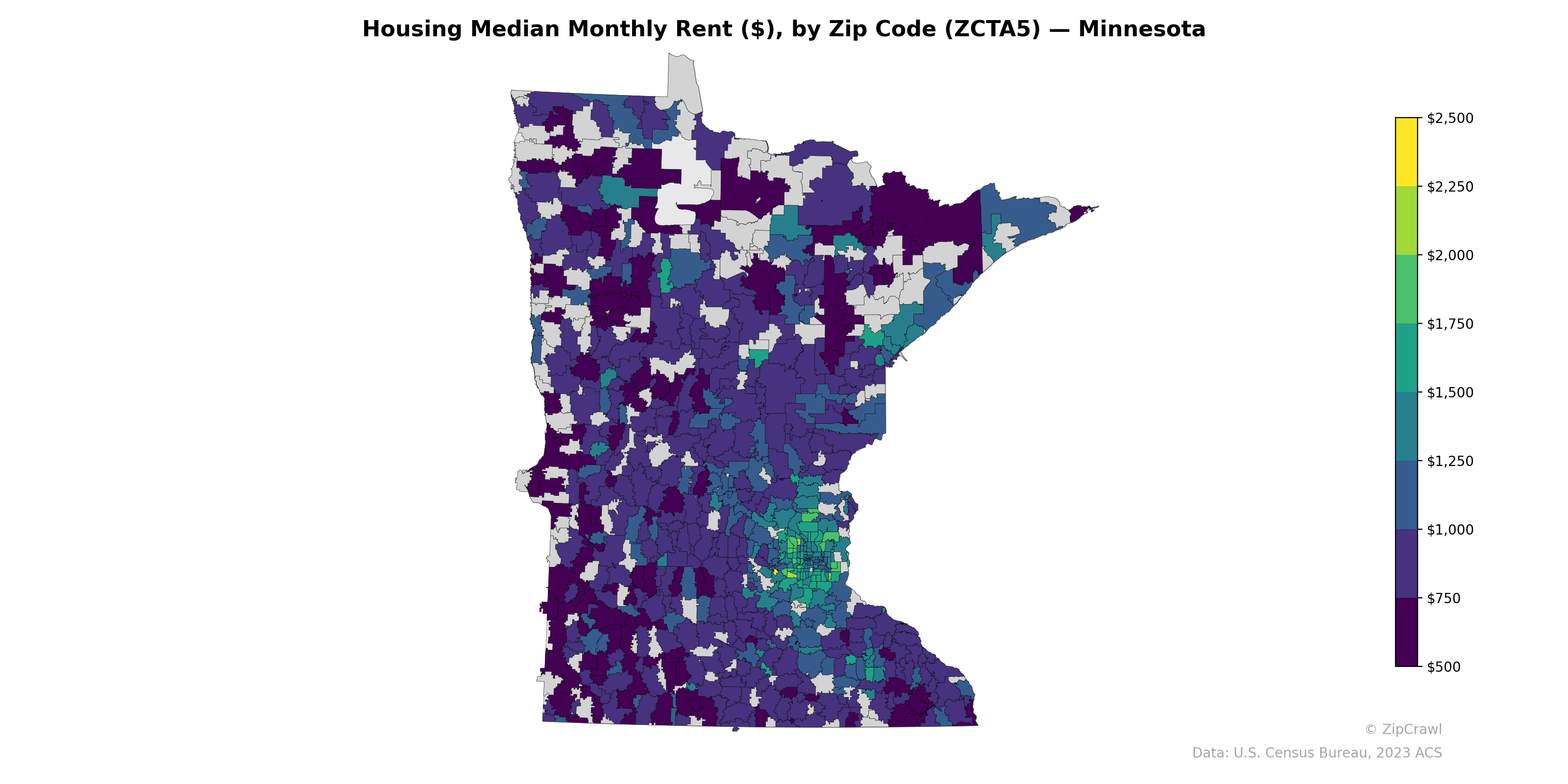 The Twin Cities metropolitan area stands out as the dominant high-rent cluster, with several zip codes in the southern metro reaching $2,000–$2,500, while surrounding suburban and exurban areas generally fall in the $1,000–$1,500 range. Rural zip codes across western, southern, and north-central Minnesota consistently register the lowest median rents, predominantly in the $500–$750 range, with particularly deep purple concentrations along the western border and in the southwest corner of the state. The Duluth area and portions of the Iron Range in the northeast show moderately elevated rents compared to other non-metro regions, suggesting localized demand pressures in those communities.