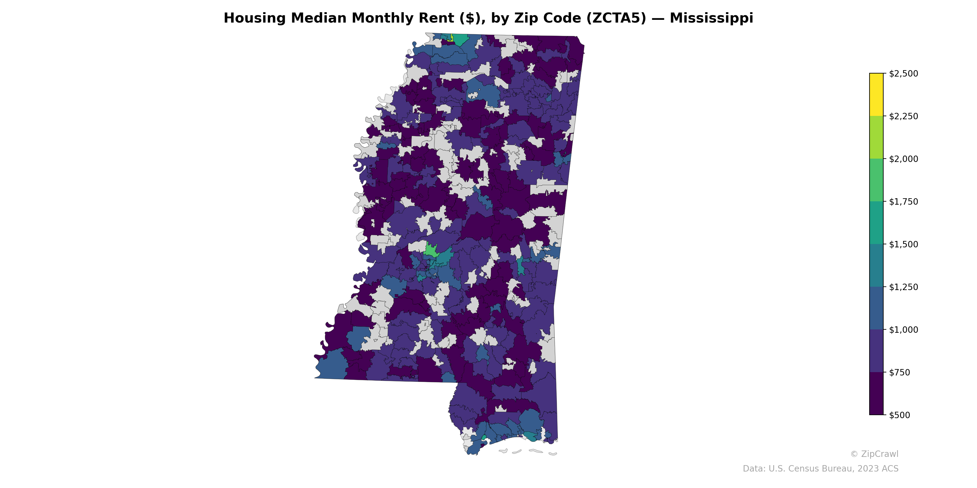Median monthly rents across Mississippi are predominantly concentrated in the $500–$750 range, with the darkest purple tones dominating rural areas of the Delta region and portions of the southwest, reflecting some of the lowest rental costs in the nation. Notable exceptions include a distinct high-rent cluster near the northern border—likely the DeSoto County suburbs of Memphis—where at least one zip code reaches the $2,500 threshold, along with moderately elevated rents in the Jackson metropolitan area and scattered pockets near Hattiesburg and the Gulf Coast. The stark contrast between the consistently low-rent Delta corridor running along the western edge and the higher values in suburban and university-adjacent zip codes underscores the deep economic stratification across the state's geography.