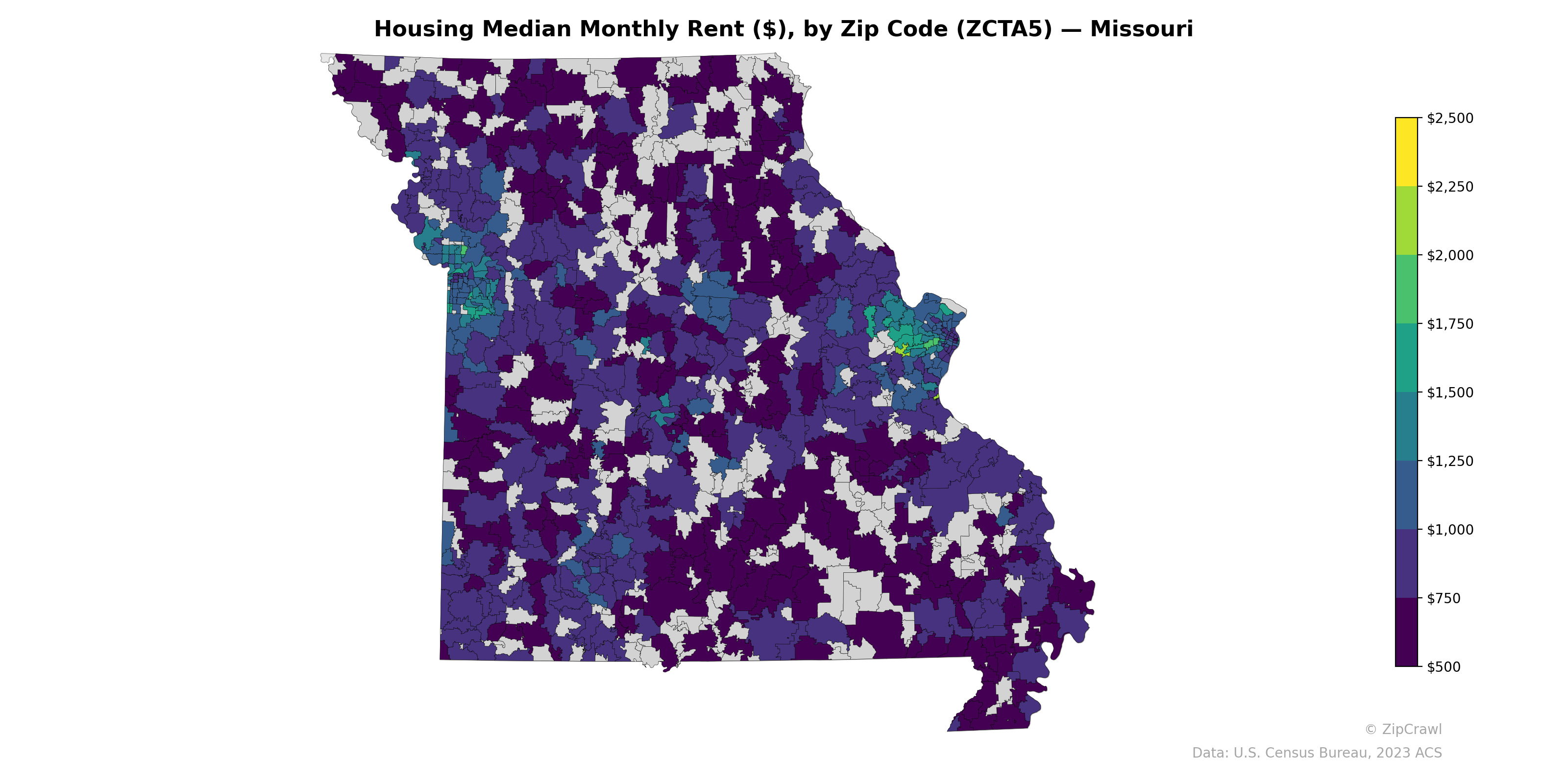 The St. Louis metropolitan area on the eastern border displays the most pronounced rent gradient in the state, with a small cluster of zip codes reaching $2,000–$2,500 in the western suburbs while adjacent urban zip codes fall below $750, illustrating stark intra-metro inequality. The Kansas City metro on the western border shows a similar but more moderate pattern, with several zip codes in the $1,000–$1,500 range surrounded by lower-rent areas. Rural southern and south-central Missouri consistently registers the lowest median rents statewide, predominantly in the $400–$650 range, while a broad swath of mid-state zip codes—particularly along the I-44 and I-70 corridors—clusters in the $600–$800 range.