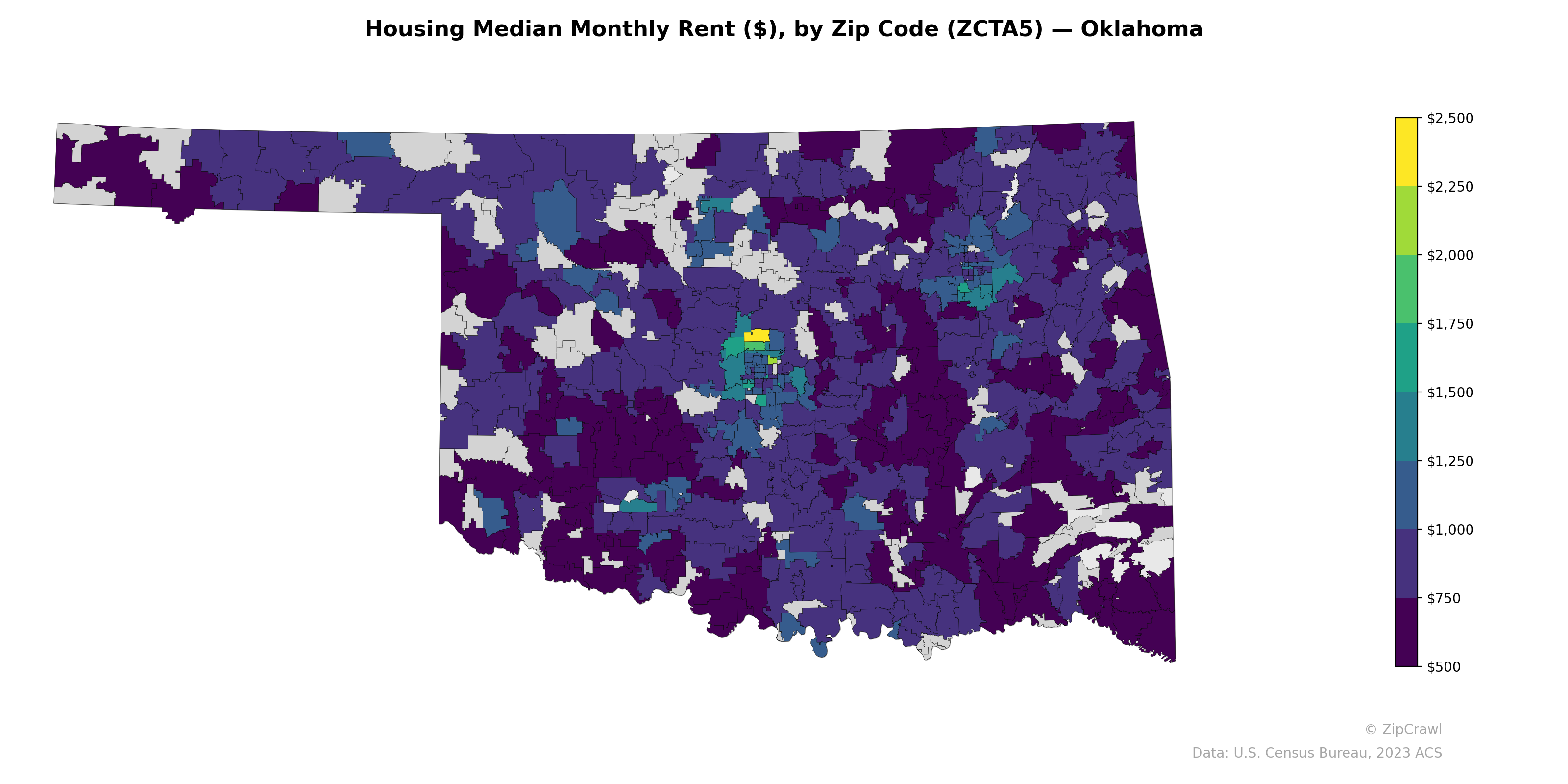 The Oklahoma City metropolitan area stands out as the dominant rent cluster, with select zip codes in the central core reaching $2,000–$2,500 monthly—likely corresponding to affluent suburbs like Edmond and Nichols Hills—while surrounding urban zip codes range from $1,000 to $1,500. The Tulsa metro area in the northeast displays a similar but more modest pattern, with pockets of teal indicating rents in the $1,250–$1,750 range amid a largely lower-rent region. Rural zip codes across southern and southeastern Oklahoma consistently register the lowest median rents, predominantly below $750, creating a stark urban-rural divide that intensifies toward the state's less populated corners.