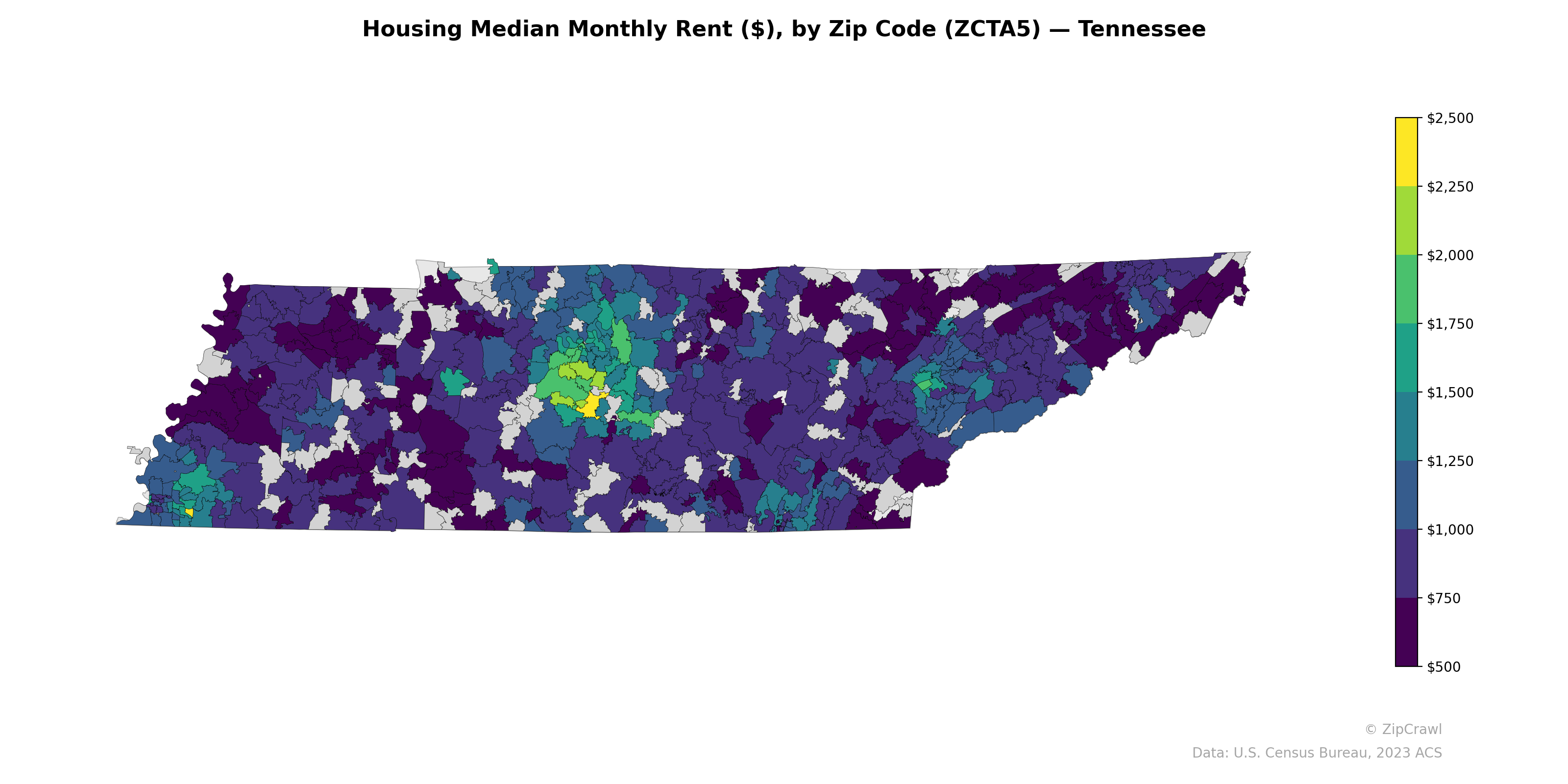 The Nashville metropolitan area stands out as the dominant high-rent cluster in the state, with several zip codes in and around Davidson County reaching $2,000–$2,500 in median monthly rent, while surrounding Middle Tennessee zip codes transition sharply to the $750–$1,000 range. The eastern portion of the state near the Tri-Cities region and parts of the Knoxville metro show moderate rents in the $1,000–$1,500 range, whereas rural zip codes across southern Middle Tennessee and the Cumberland Plateau consistently register among the lowest rents at $500–$750. A secondary pocket of elevated rents appears in the southwestern corner near the Memphis metro, though it remains considerably more modest than the Nashville core.