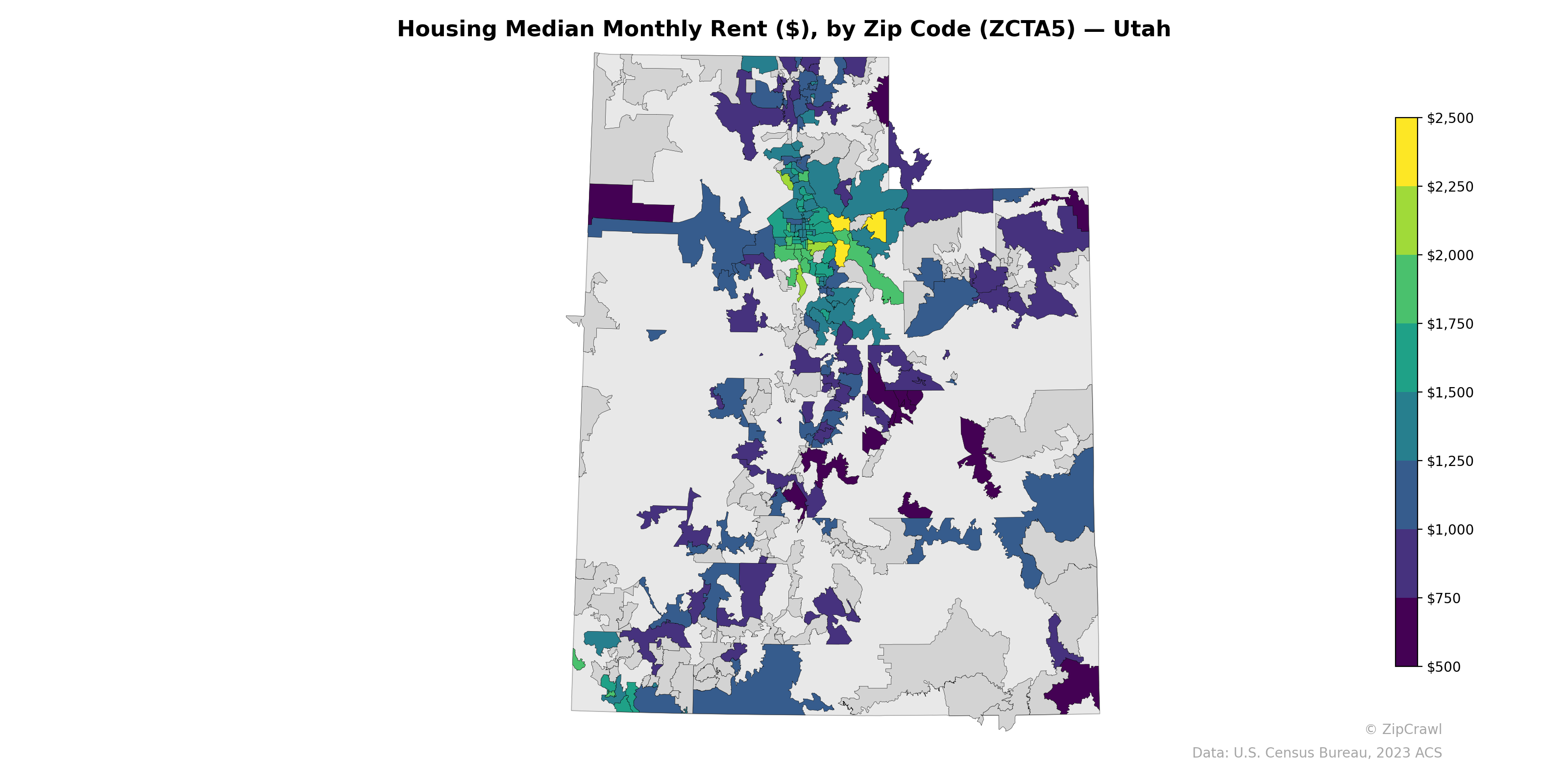 The highest median rents, exceeding $2,000–$2,500 per month, concentrate in the Wasatch Front's eastern suburbs—particularly in zip codes corresponding to areas like Draper, Alpine, and the Park City corridor—while adjacent urban cores such as Salt Lake City proper display moderate rents in the $1,250–$1,750 range. Rural zip codes across western Utah, the central highlands, and much of the southern portion of the state remain predominantly gray (lacking sufficient data) or fall below $750, reflecting sparse rental markets. A notable contrast exists between the deep purple low-rent pockets in areas like Carbon and Emery counties and the bright yellow high-rent enclaves along the Wasatch Back, underscoring the sharp urban-rural rent divide driven by proximity to employment centers and resort economies.
