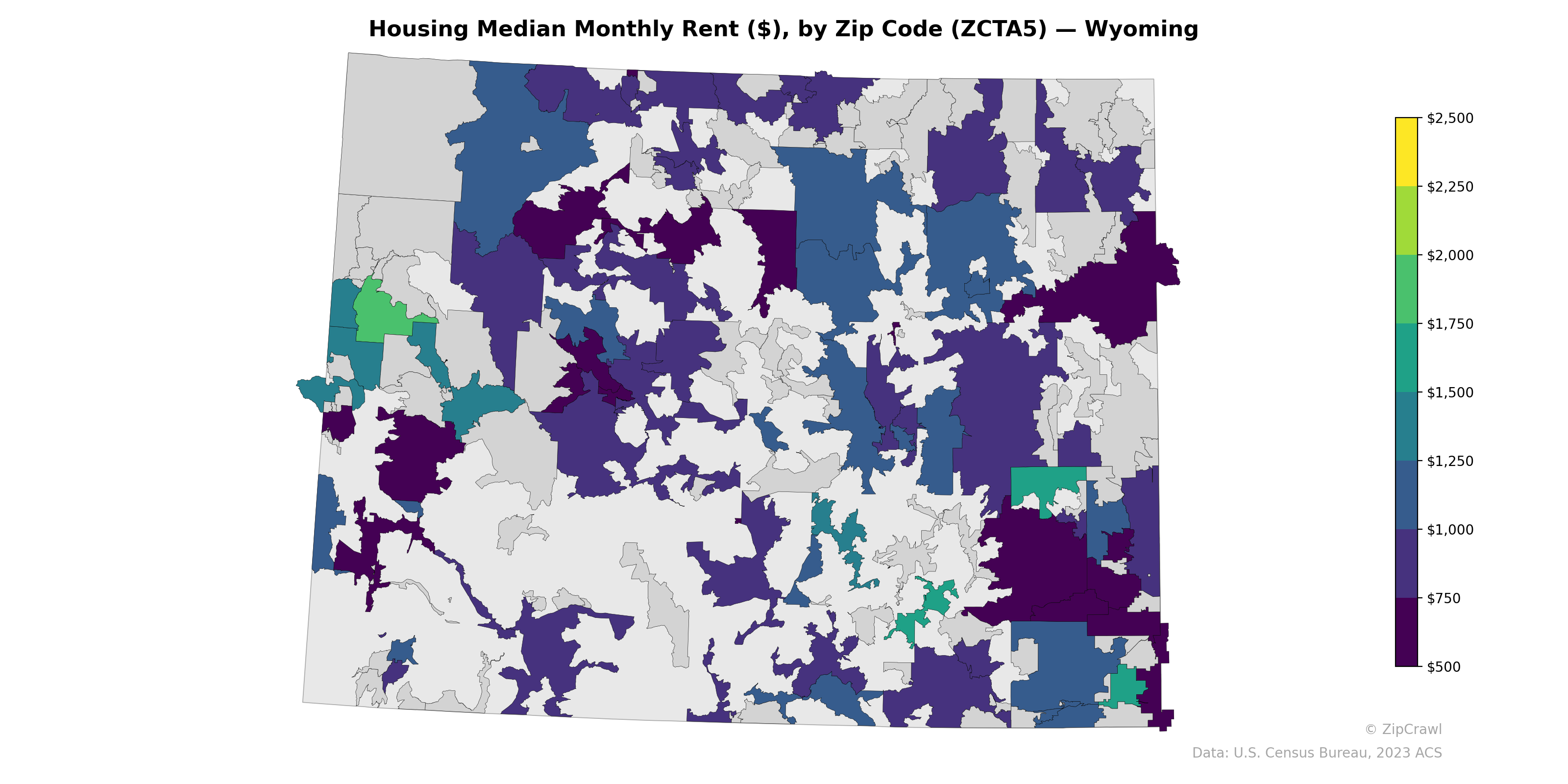 Median monthly rents across Wyoming zip codes predominantly fall in the $500–$1,000 range, with notable concentrations of higher rents in the northwestern corner near Jackson (Teton County), where values approach or exceed $2,000, reflecting the area's resort-driven housing market. The southeastern corridor around Cheyenne and Laramie displays moderate rents in the $750–$1,250 range, while much of the central and eastern portions of the state show lower rents interspersed with gray areas indicating insufficient data in sparsely populated zip codes. A striking contrast exists between the deeply purple low-rent zones scattered across the interior and the teal-to-green pockets near Jackson and parts of the south-central region, underscoring the outsized influence of tourism and energy-sector economies on local housing costs.