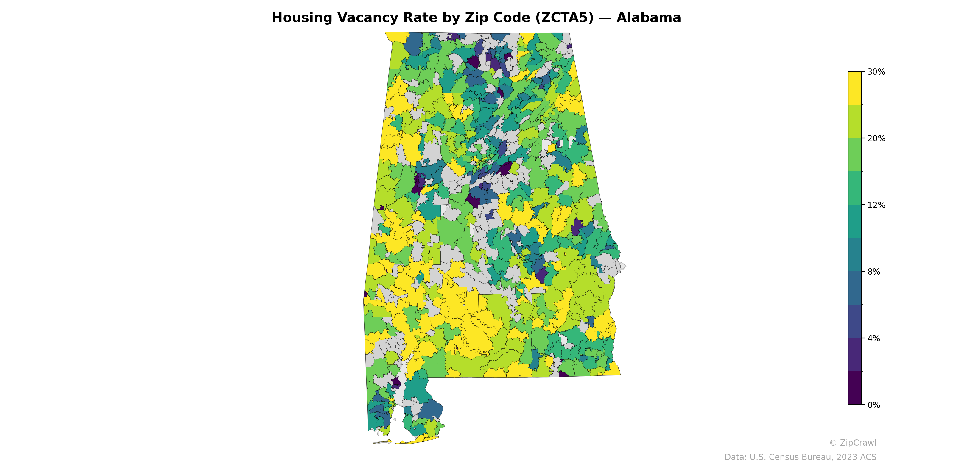 Housing vacancy rates across Alabama exhibit substantial spatial variation, with the highest concentrations (20–30%+) clustered in rural Black Belt counties in the south-central part of the state and portions of the western border region. Urban cores and their surrounding suburban zip codes—particularly around Birmingham, Huntsville, and Mobile—display notably lower vacancy rates, often falling below 8%, reflecting stronger housing demand in metropolitan areas. A scattering of deep purple zip codes with near-zero vacancy rates appears in select suburban and exurban areas, likely indicating tight housing markets in high-growth communities.