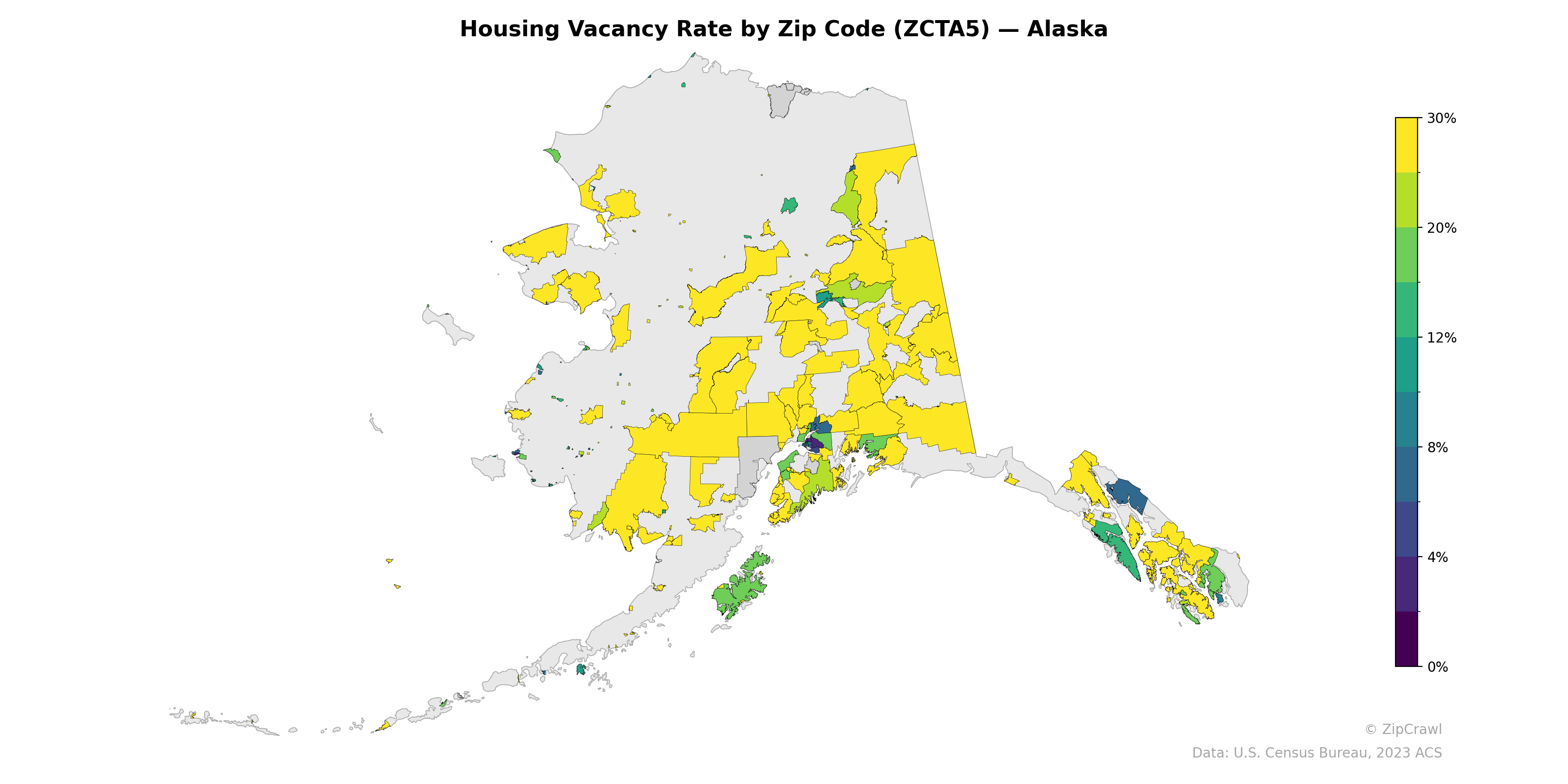 Alaska's housing vacancy rates exhibit stark regional variation, with many interior and western rural zip codes displaying rates at or above 20–30%, likely reflecting seasonal housing and remote communities with limited year-round occupancy. The Anchorage metro area and Fairbanks region contain notable pockets of lower vacancy in the 4–12% range, consistent with denser, more stable urban housing markets. The southeastern panhandle presents a mixed pattern, with several zip codes around Juneau and Sitka showing moderate-to-low vacancy rates in the green range (8–15%), while at least one area registers near 0%, suggesting extremely tight housing supply.