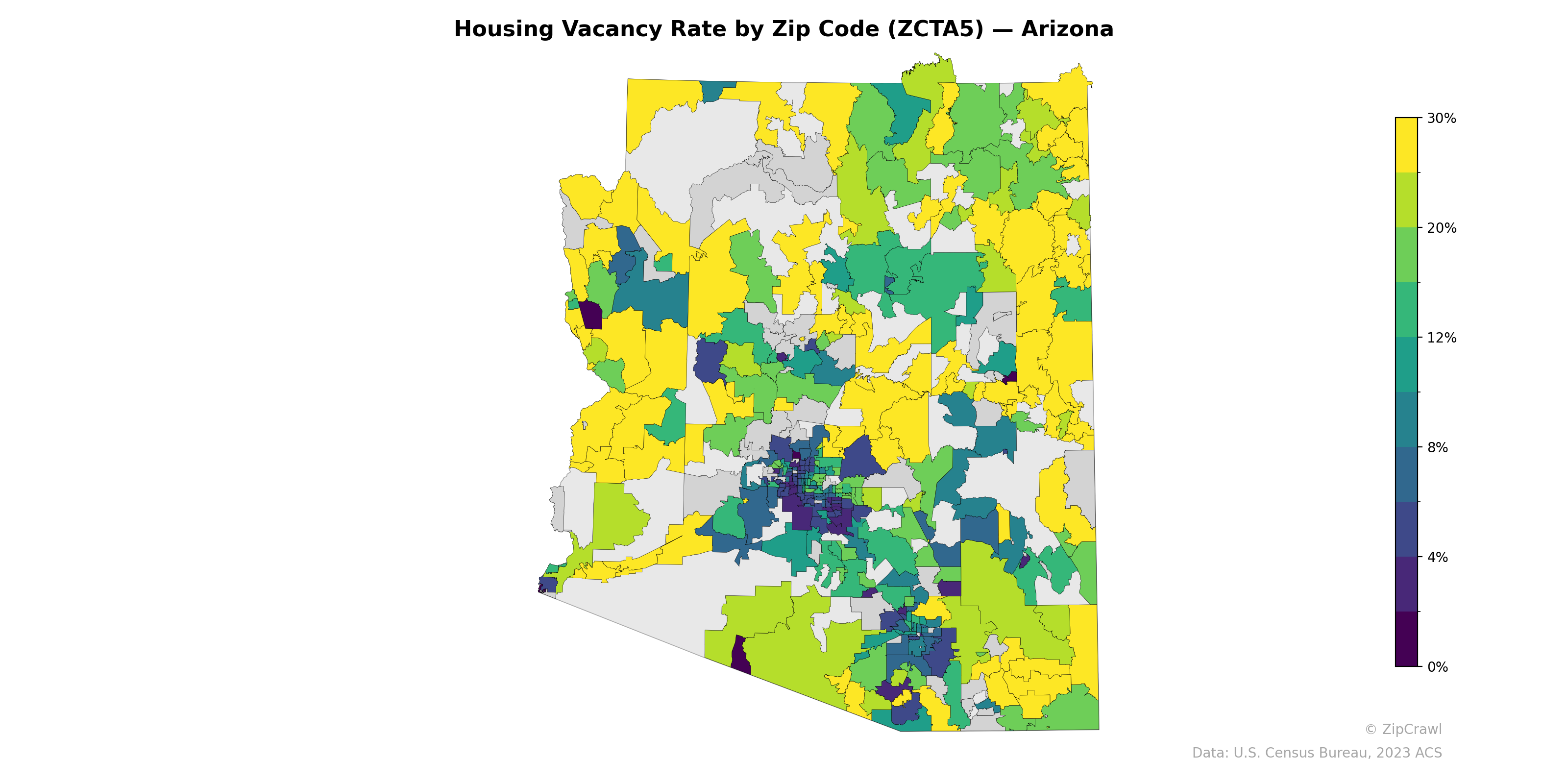 Rural and peripheral zip codes across northern, eastern, and western Arizona exhibit the highest housing vacancy rates, frequently exceeding 20–30%, consistent with seasonal-use properties, tribal lands, and sparsely populated areas. The Phoenix metropolitan core displays a stark contrast, with densely clustered zip codes in the 0–4% range indicating tight housing occupancy, while surrounding suburban and exurban zones transition to moderate 8–12% vacancy rates. Tucson follows a similar but less pronounced pattern, with low-vacancy urban zip codes ringed by higher-vacancy areas, particularly to the south and southeast near the U.S.–Mexico border.
