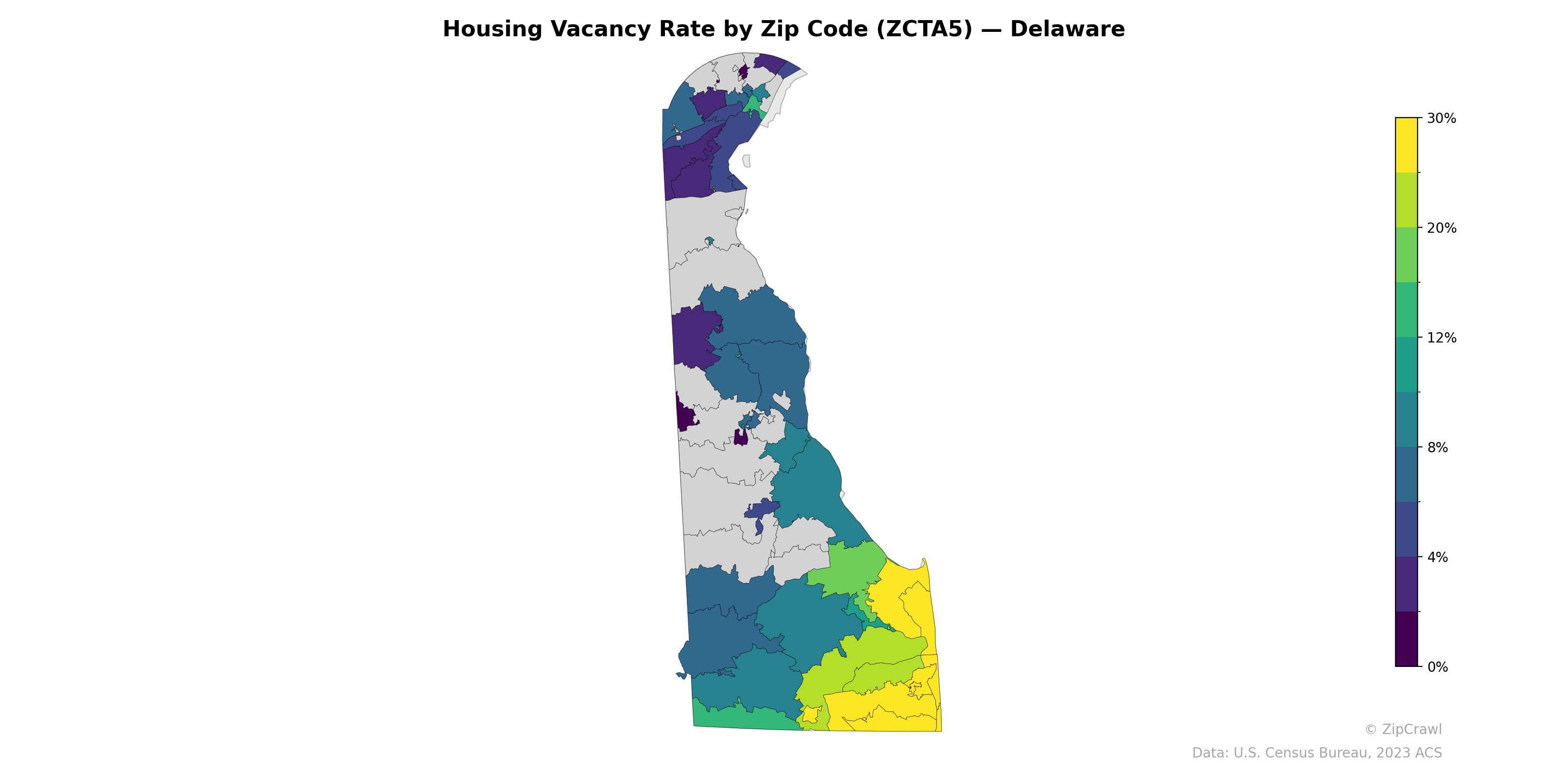 The highest housing vacancy rates in Delaware, exceeding 30%, are concentrated in the southeastern coastal zip codes of Sussex County, consistent with the prevalence of seasonal and vacation properties in beach communities like Rehoboth, Bethany, and Fenwick Island. Northern Delaware, particularly the Wilmington metro area in New Castle County, exhibits markedly lower vacancy rates generally below 8%, with several zip codes in the 0–4% range reflecting tighter housing markets in more urbanized and suburban areas. A notable transition zone exists through central Kent County, where vacancy rates shift from the low single digits in the west to moderate levels (8–12%) moving eastward toward the coast.