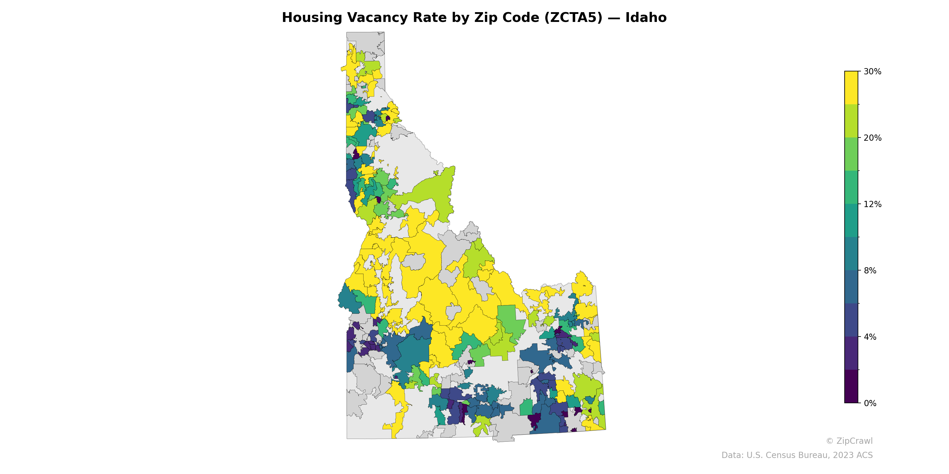 Central Idaho's vast, sparsely populated zip codes exhibit the highest vacancy rates, frequently exceeding 20–30%, consistent with areas dominated by seasonal recreation properties and national forest land. The Boise metropolitan area and surrounding Treasure Valley zip codes in the southwest display notably low vacancy rates, generally below 4–8%, reflecting sustained housing demand in the state's primary population center. A similar pattern of low vacancy appears in the southeastern corner around the Idaho Falls–Pocatello corridor, while northern Idaho presents a more heterogeneous mix, with pockets of very low vacancy near Coeur d'Alene and Moscow contrasting with higher-vacancy rural zones nearby.