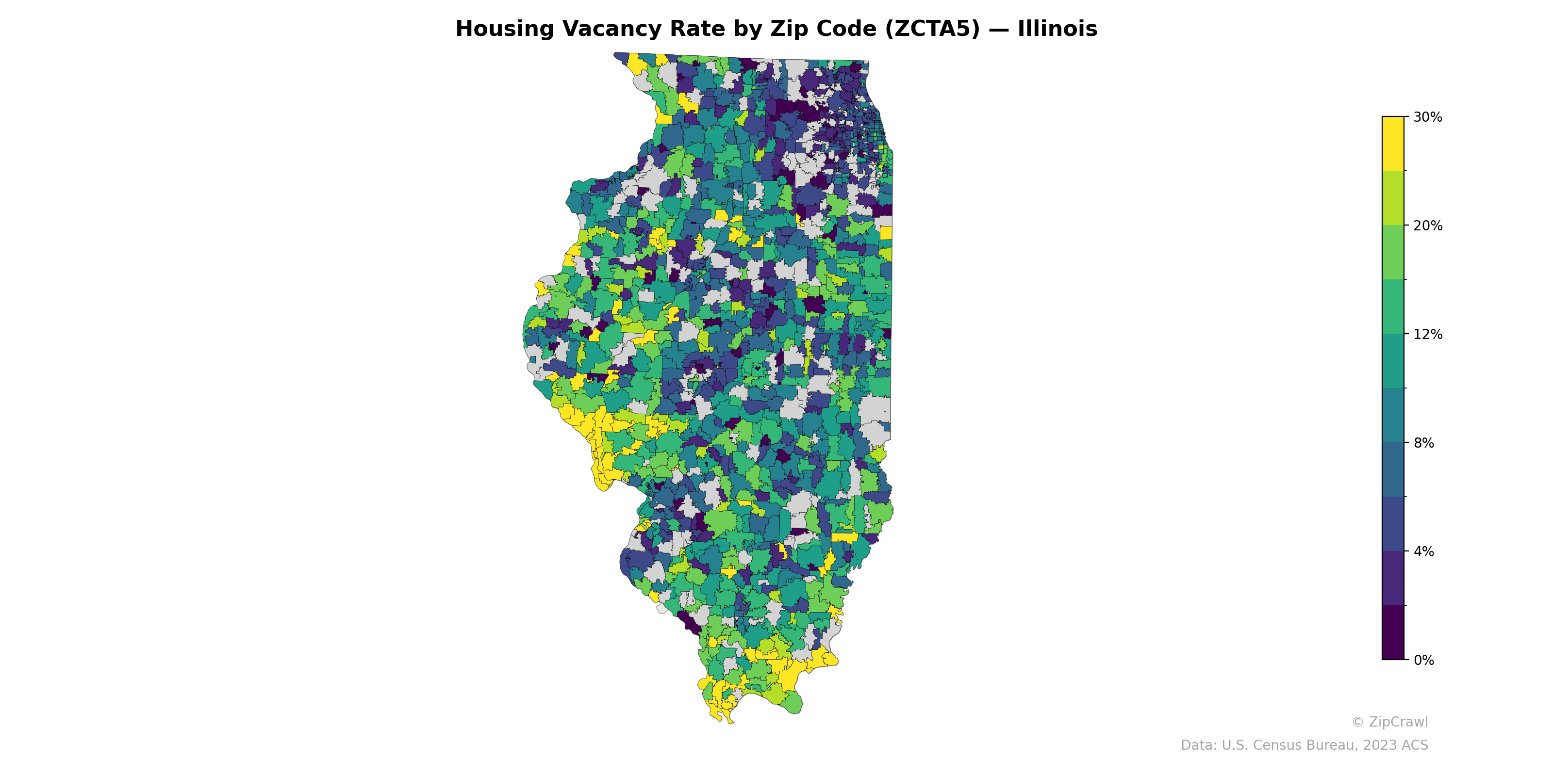 The southern tip of Illinois exhibits notably elevated vacancy rates, with many zip codes exceeding 20–30%, consistent with long-term population decline in the Cairo and Shawnee National Forest region. The Chicago metropolitan area in the northeast displays stark internal contrasts, with some suburban zip codes registering near-zero vacancy alongside pockets of significantly higher rates, likely corresponding to areas of urban disinvestment on the city's south and west sides. Central Illinois generally clusters in the 8–12% range, though scattered rural zip codes with small housing stocks push noticeably higher, particularly along the western border near the Mississippi River corridor.