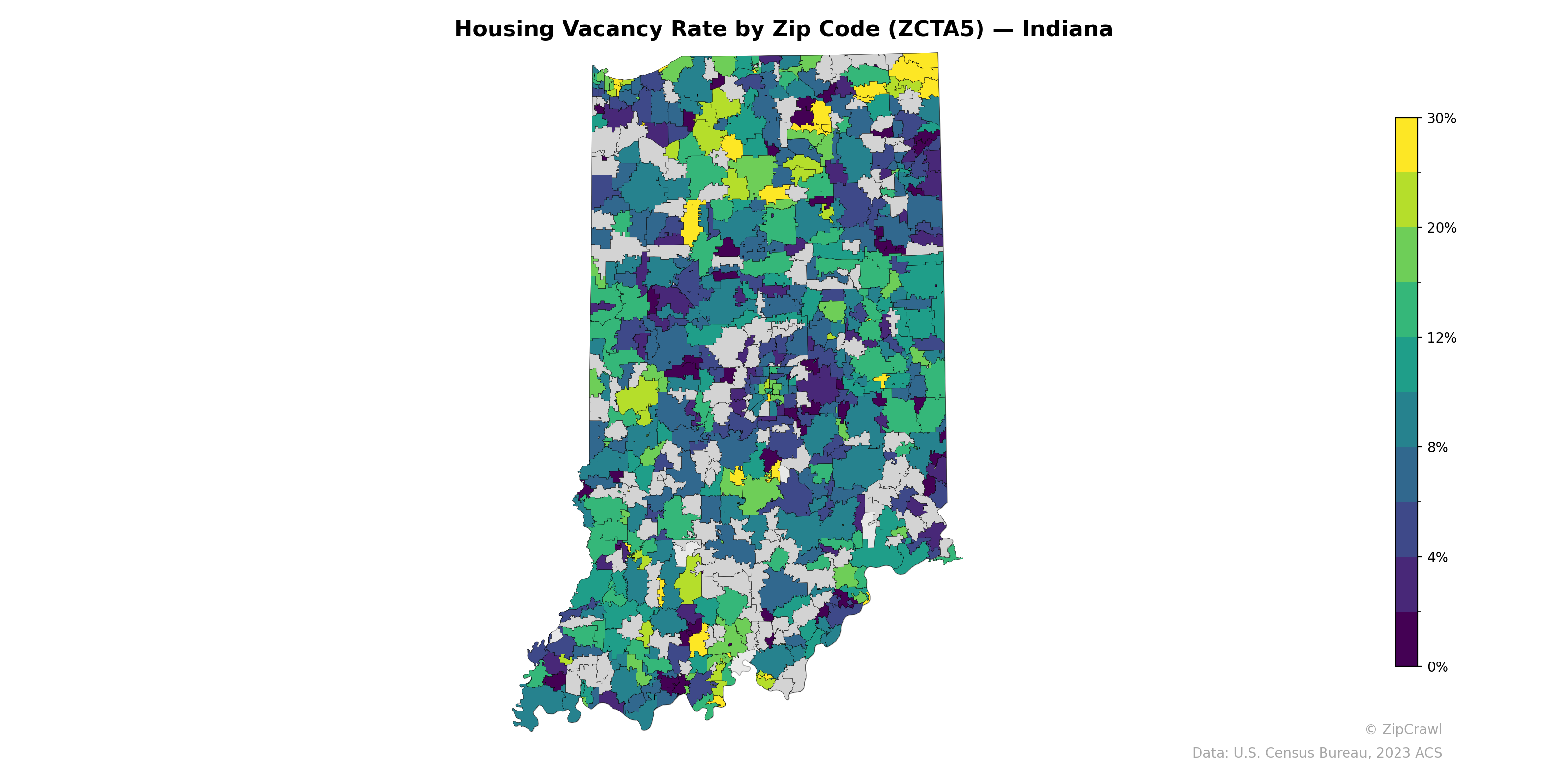 Housing vacancy rates across Indiana exhibit notable geographic variation, with the highest concentrations (20–30%+) clustered in the rural southern counties along the Ohio River corridor and scattered areas of northern Indiana near the Michigan border. The Indianapolis metropolitan area and surrounding suburban zip codes in central Indiana generally display lower vacancy rates in the 4–8% range, consistent with stronger housing demand in the state's economic core. A band of moderate-to-high vacancy (12–20%) is visible across much of rural west-central and east-central Indiana, suggesting persistent population decline in smaller communities outside major employment centers.