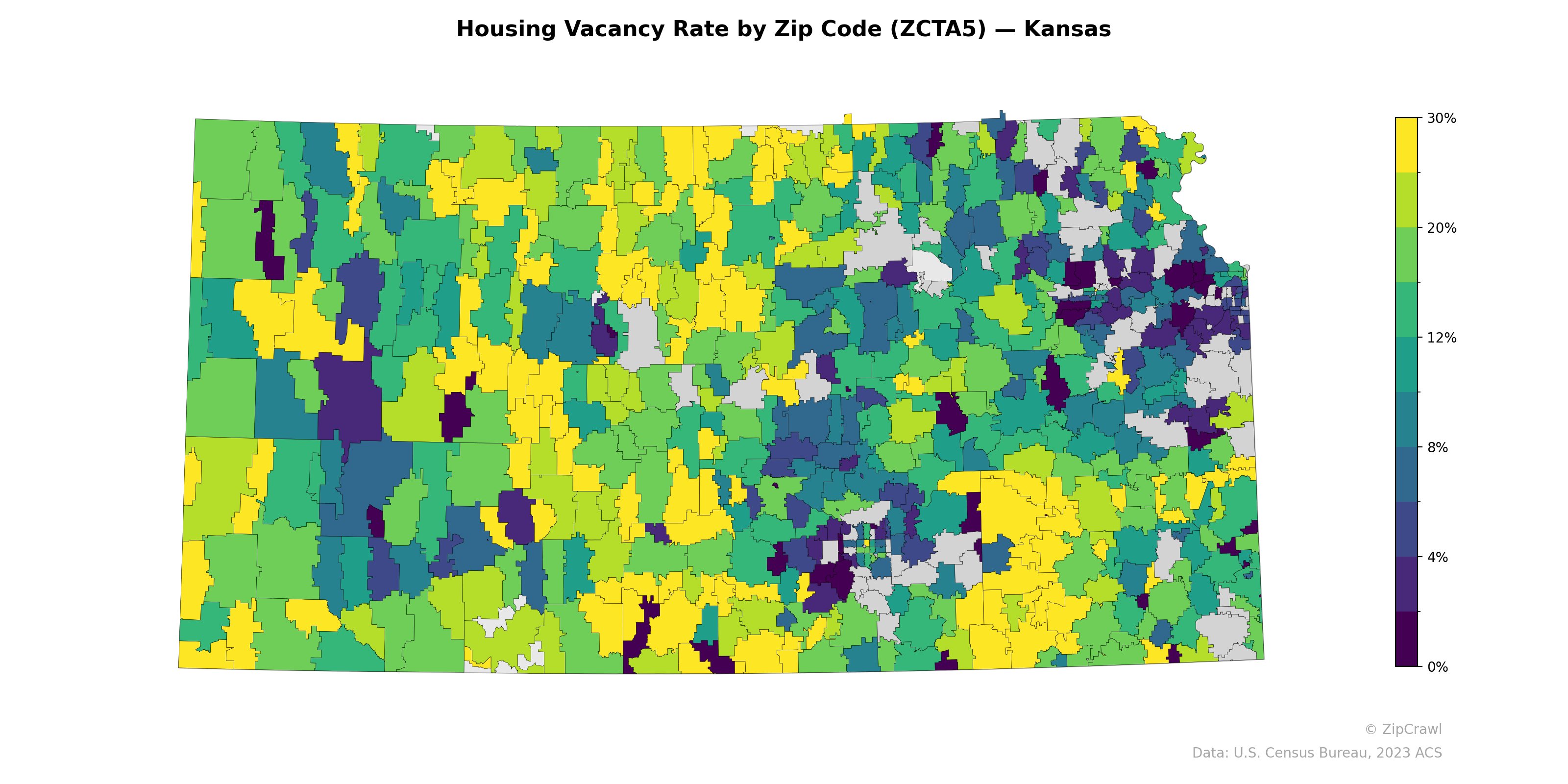 Housing vacancy rates across Kansas display significant spatial heterogeneity, with the Kansas City metropolitan area in the northeast exhibiting notably low vacancy rates (dark purple, near 0–4%), consistent with strong housing demand in the state's largest urban center. Rural western and central Kansas zip codes tend toward higher vacancy rates (yellow-green, 20–30%), particularly in the northwest quadrant and scattered agricultural communities, reflecting ongoing population decline in these areas. A notable cluster of very low vacancy also appears around the Wichita metro area in south-central Kansas, while isolated high-vacancy pockets in the southwest suggest economically distressed small towns interspersed among moderately vacant surrounding areas.