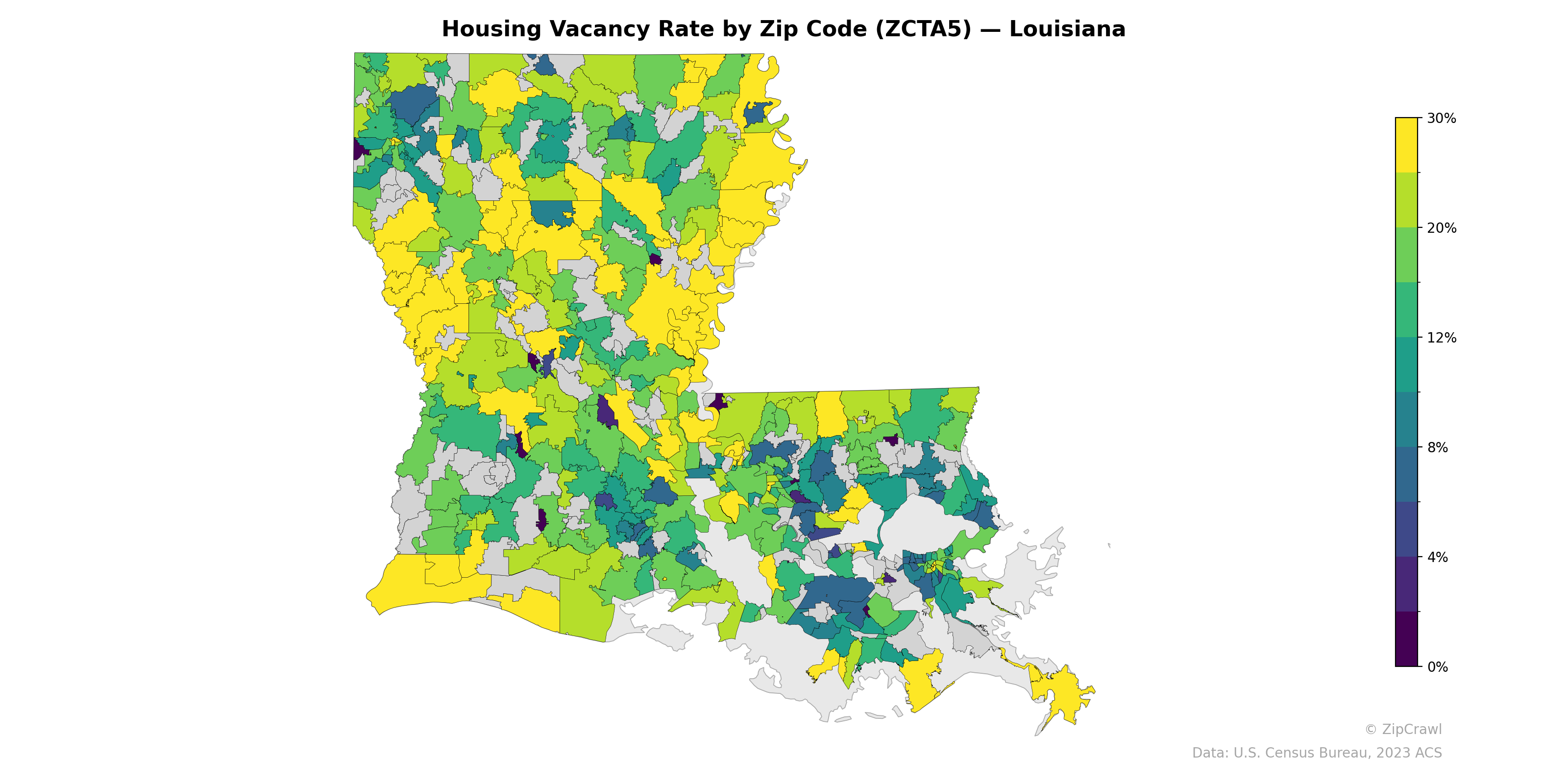 Housing vacancy rates across Louisiana exhibit a pronounced north-south gradient, with the highest concentrations (20–30%+) clustered in the rural central and north-central parishes, particularly in the Mississippi Delta region and areas west of Monroe. The greater New Orleans metropolitan area in the southeast displays notably lower vacancy rates, generally below 8%, though several isolated zip codes within the city register near-zero rates characteristic of dense urban cores. Southwestern Louisiana around the Lake Charles area and the Acadiana region show moderate vacancy rates in the 8–15% range, while scattered high-vacancy outliers in coastal zones likely reflect seasonal or storm-damaged housing stock.
