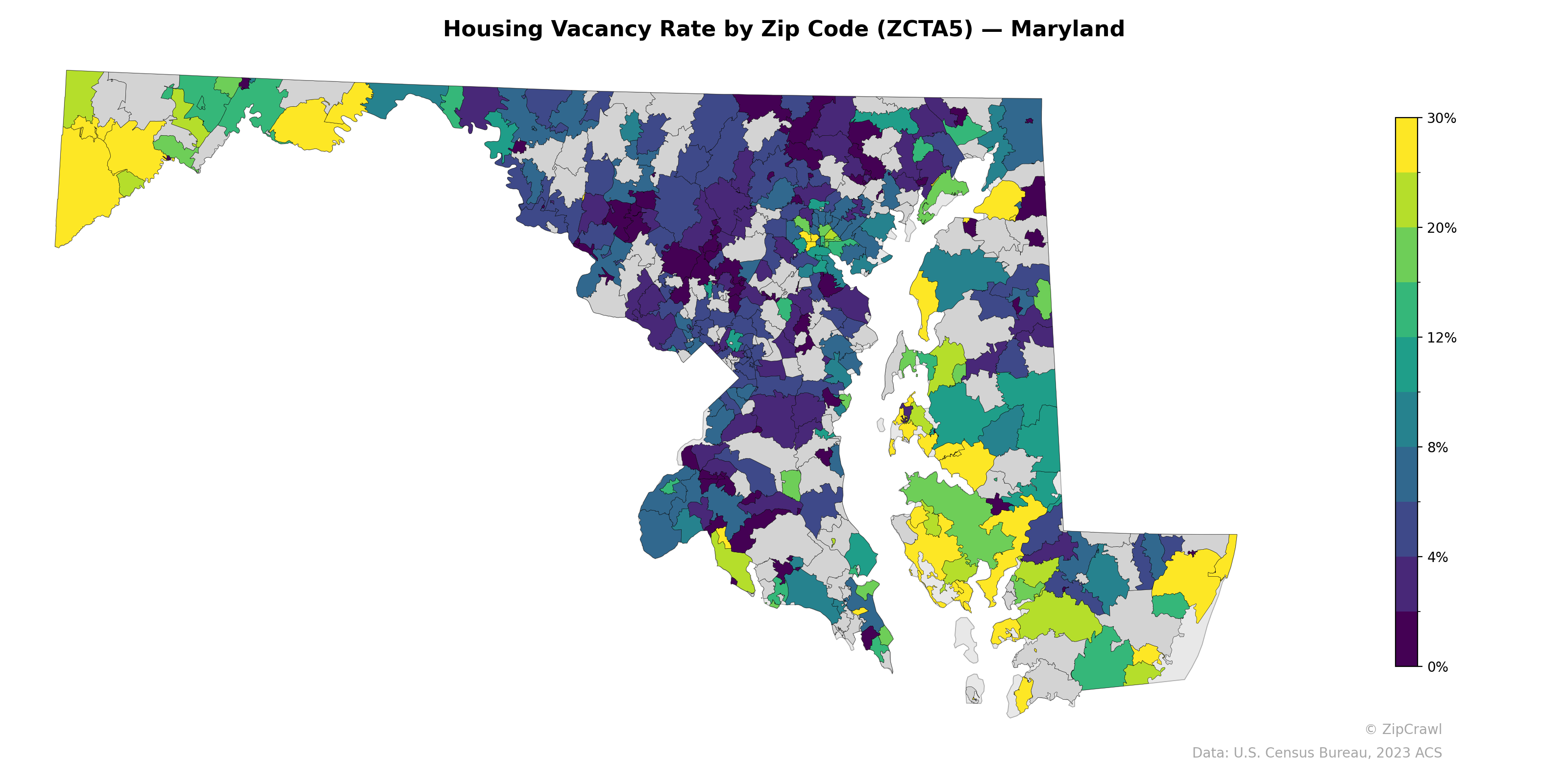 The Eastern Shore and Ocean City coastal areas exhibit the highest vacancy rates in the state, with many zip codes exceeding 20–30%, likely reflecting seasonal and vacation housing stock. By contrast, the central Maryland corridor—spanning the Baltimore-Washington suburbs including Montgomery, Howard, and Anne Arundel counties—consistently registers vacancy rates below 4%, indicative of tight housing markets with sustained demand. Western Maryland displays notable variability, with some zip codes in Garrett and Allegany counties showing elevated vacancy rates above 15% alongside pockets of lower vacancy, suggesting uneven demand patterns in more rural and recreational areas.