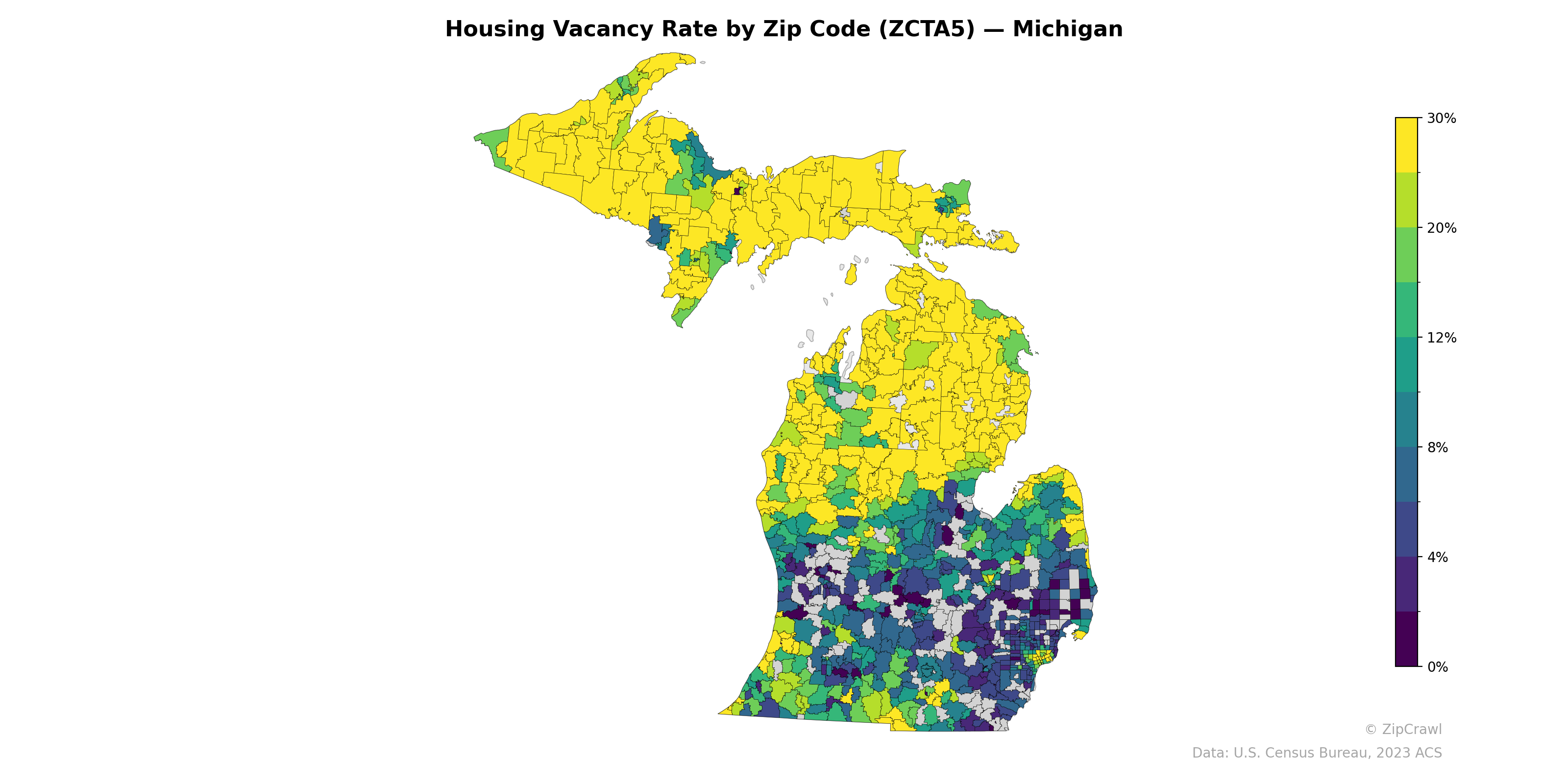 The Upper Peninsula and northern Lower Peninsula exhibit predominantly high vacancy rates exceeding 20-30%, consistent with seasonal and vacation housing stock in rural and resort communities along the Lake Michigan and Lake Huron shorelines. A sharp contrast emerges in the southeastern Lower Peninsula, where the Detroit metropolitan area and surrounding suburban zip codes display vacancy rates generally below 4-8%, reflecting denser, year-round occupied housing markets. Mid-state transitional zones, particularly around the Grand Rapids, Lansing, and Traverse City corridors, show moderate vacancy rates in the 8-12% range with pockets of lower vacancy near urban cores.