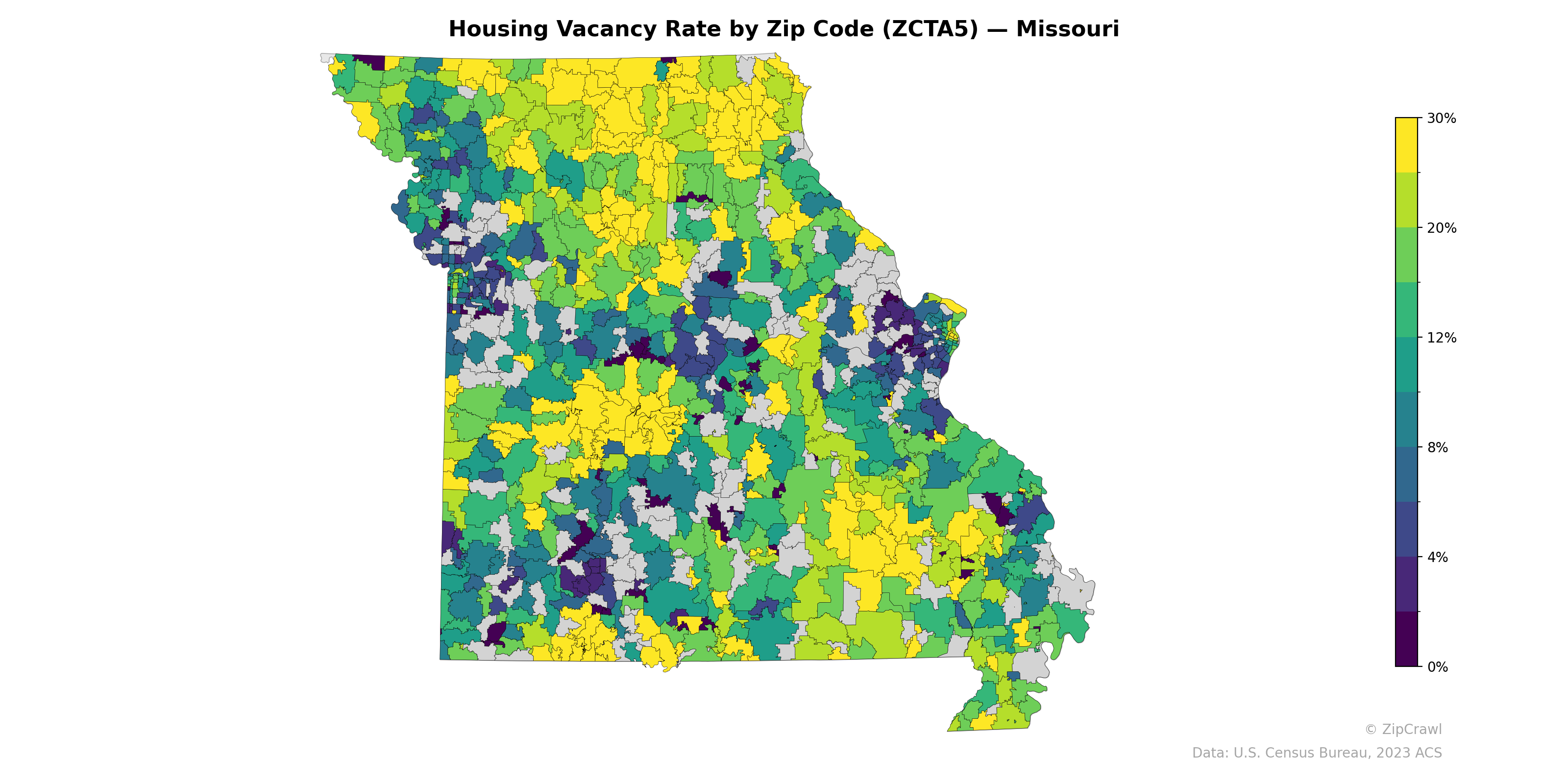 Rural southern Missouri and the Lake of the Ozarks region exhibit the highest housing vacancy rates, frequently exceeding 20–30%, consistent with areas dominated by seasonal and recreational properties. The Kansas City and St. Louis metropolitan zip codes display notably lower vacancy rates, generally below 8%, with many suburban zip codes in the 2–4% range reflecting tight housing markets. A scattered patchwork of moderate-to-high vacancy (12–20%) persists across north-central Missouri's agricultural communities, contrasting with the consistently low-vacancy corridors along the I-70 urban spine connecting the state's two major metros.