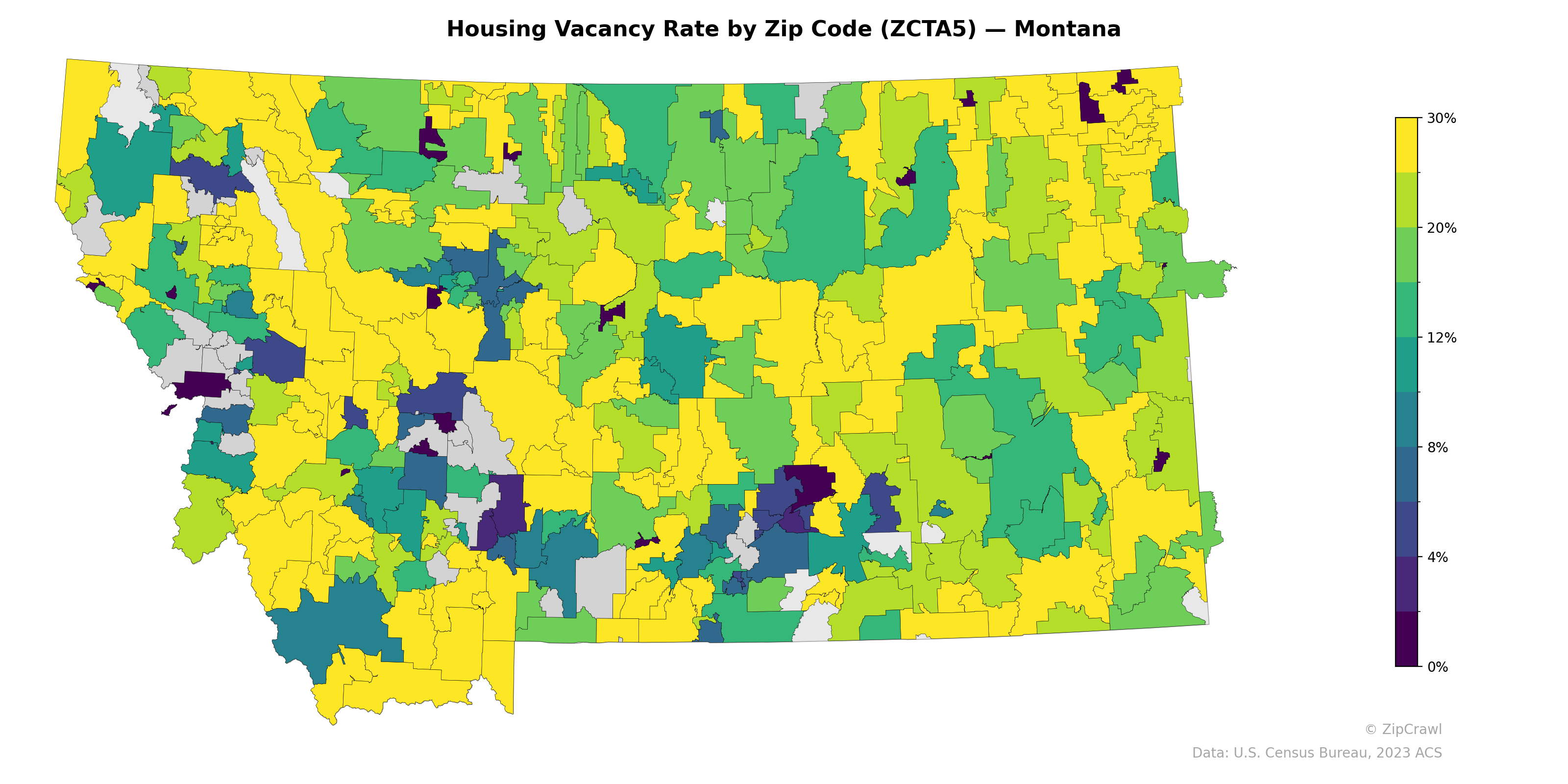 Housing vacancy rates across Montana exhibit considerable spatial heterogeneity, with the highest rates (25–30%+) concentrated in the yellow-shaded eastern plains and parts of the north-central region, likely reflecting rural depopulation and limited housing demand. In contrast, the lowest vacancy rates (0–4%) cluster in the western mountainous corridor—particularly around areas consistent with Missoula, Butte, and parts of the greater Flathead region—where tighter housing markets and population growth suppress available inventory. Several isolated dark purple pockets scattered across the south-central and reservation areas suggest localized conditions such as seasonal housing, tribal land dynamics, or small-sample statistical volatility in sparsely populated zip codes.