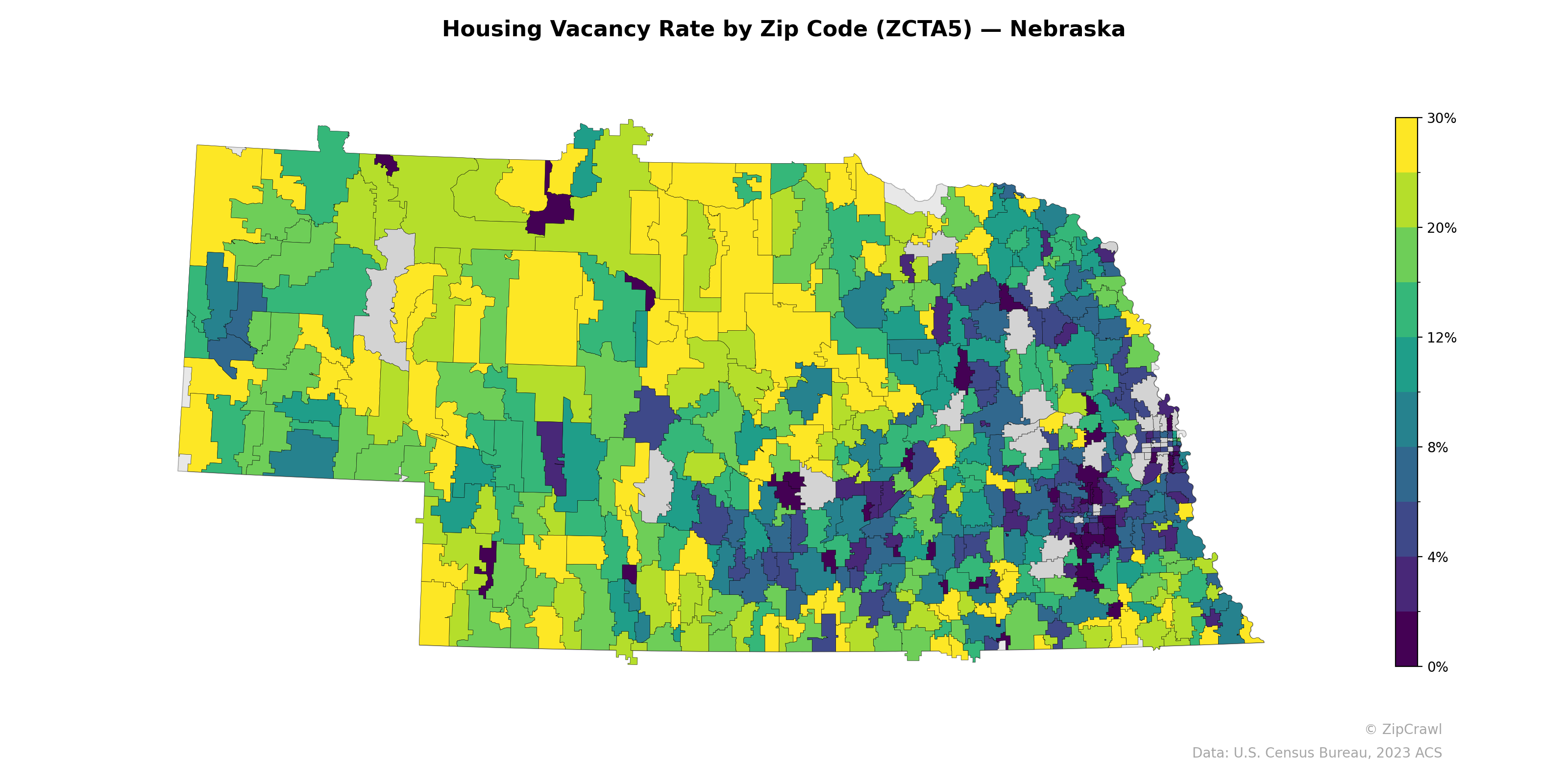Housing vacancy rates across Nebraska exhibit a pronounced east-west gradient, with the western Panhandle and Sand Hills region displaying generally moderate-to-high vacancy rates (12–20%+), while the eastern third of the state—particularly the Omaha and Lincoln metropolitan corridors—contains concentrated clusters of very low vacancy (under 4%), reflecting tighter urban housing markets. Several isolated rural zip codes scattered throughout central and south-central Nebraska register extremely high vacancy rates above 25%, likely corresponding to small, depopulating communities. Notable pockets of near-zero vacancy appear in the southeastern corner and around the Omaha metro area, contrasting sharply with adjacent rural zip codes that often exceed 15%.
