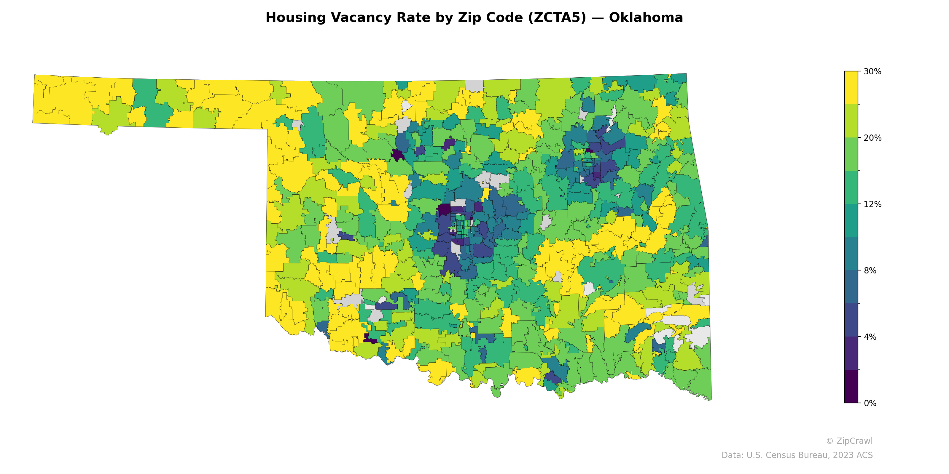 The Oklahoma City and Tulsa metropolitan cores exhibit notably low vacancy rates, often below 4%, reflecting strong housing demand in the state's primary urban centers, while their surrounding suburban zip codes transition to moderate rates in the 8–12% range. Rural western Oklahoma, particularly the central-west and southwestern panhandle-adjacent regions, displays consistently elevated vacancy rates exceeding 20%, indicative of population decline and weaker housing markets in agricultural communities. A distinct east-west gradient emerges, with northeastern Oklahoma around the Tulsa metro maintaining tighter housing markets compared to the sparsely populated western half of the state.