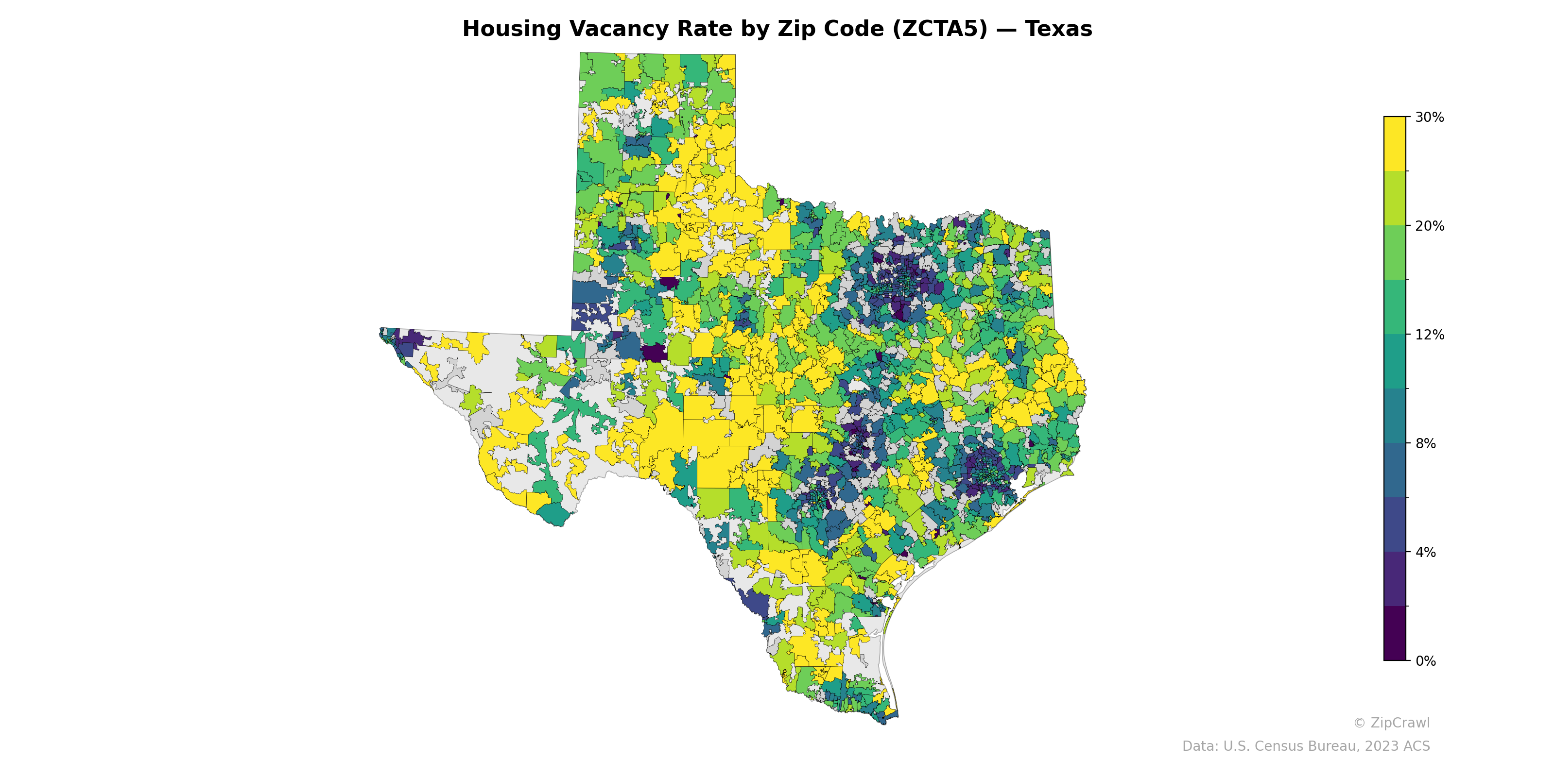 Housing vacancy rates across Texas exhibit a clear urban-suburban divide, with major metro cores—particularly the Dallas-Fort Worth, Houston, San Antonio, and Austin areas—displaying notably lower vacancy rates (dark purple and blue tones, under 4%), reflecting sustained housing demand in these high-growth markets. The Texas Panhandle and western regions show considerably higher vacancy rates, frequently exceeding 20%, likely driven by rural depopulation and the cyclical nature of energy-sector employment in the Permian Basin area. Coastal zip codes along the Gulf, especially near Galveston and the lower Rio Grande Valley, display a mixed pattern with pockets of elevated vacancy that may reflect seasonal or vacation housing stock alongside economically distressed communities.