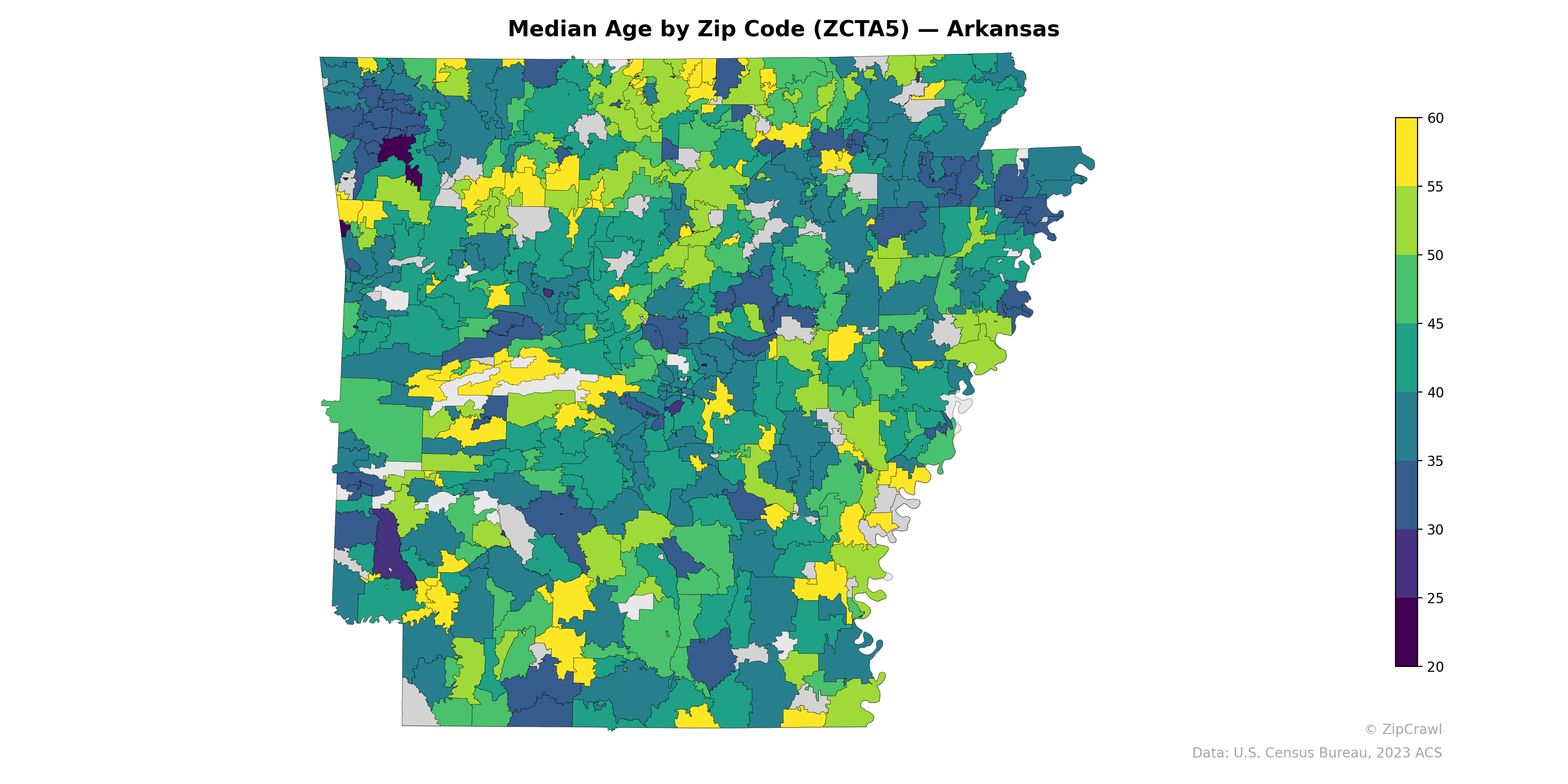 Northwest Arkansas, particularly the Fayetteville-Springdale-Rogers metropolitan corridor, displays notably lower median ages in the low-to-mid 30s, consistent with the region's rapid growth driven by younger workers and university populations. Rural zip codes in the Ozark highlands and along the southern border tend to skew older, with several areas exceeding median ages of 55, reflecting patterns of youth outmigration from economically declining communities. The central corridor around Little Rock and its suburbs presents a mixed mosaic, with younger urban core zip codes adjacent to older suburban and exurban areas, while the eastern Delta region shows considerable variability rather than a uniform age profile.