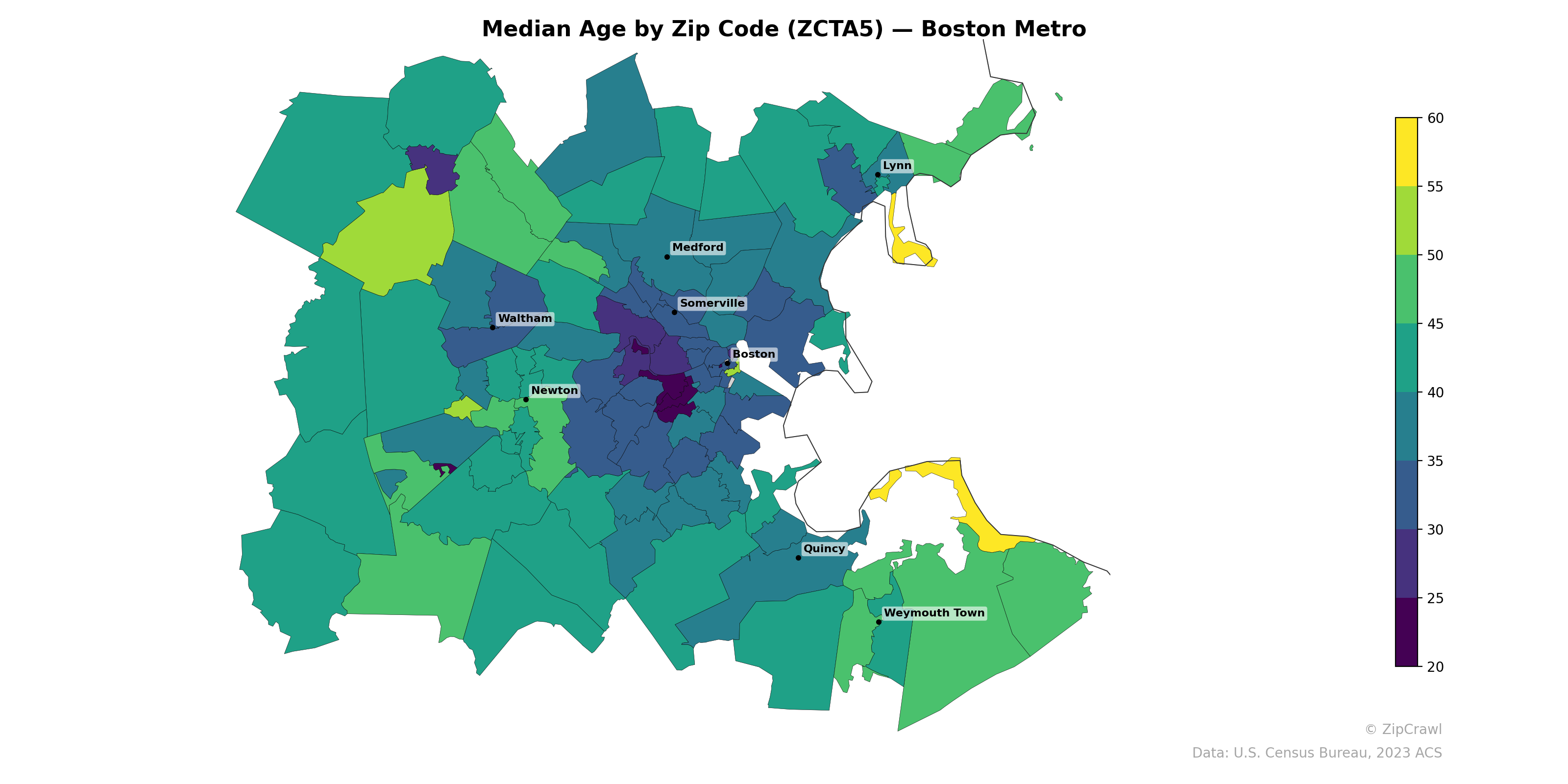 The lowest median ages in the Boston metro cluster tightly around the core Boston zip codes—particularly near the university-dense areas of Allston, Brighton, and the Fenway—where median ages dip below 25, reflecting large student populations. Suburban and exurban zip codes to the northwest and south, including parts of Newton, Waltham, and Weymouth, trend notably older with median ages in the 38–50 range. The most striking outliers are the bright yellow coastal zip codes near Lynn and Hull, where median ages exceed 55, standing in sharp contrast to the younger urban core just miles away.