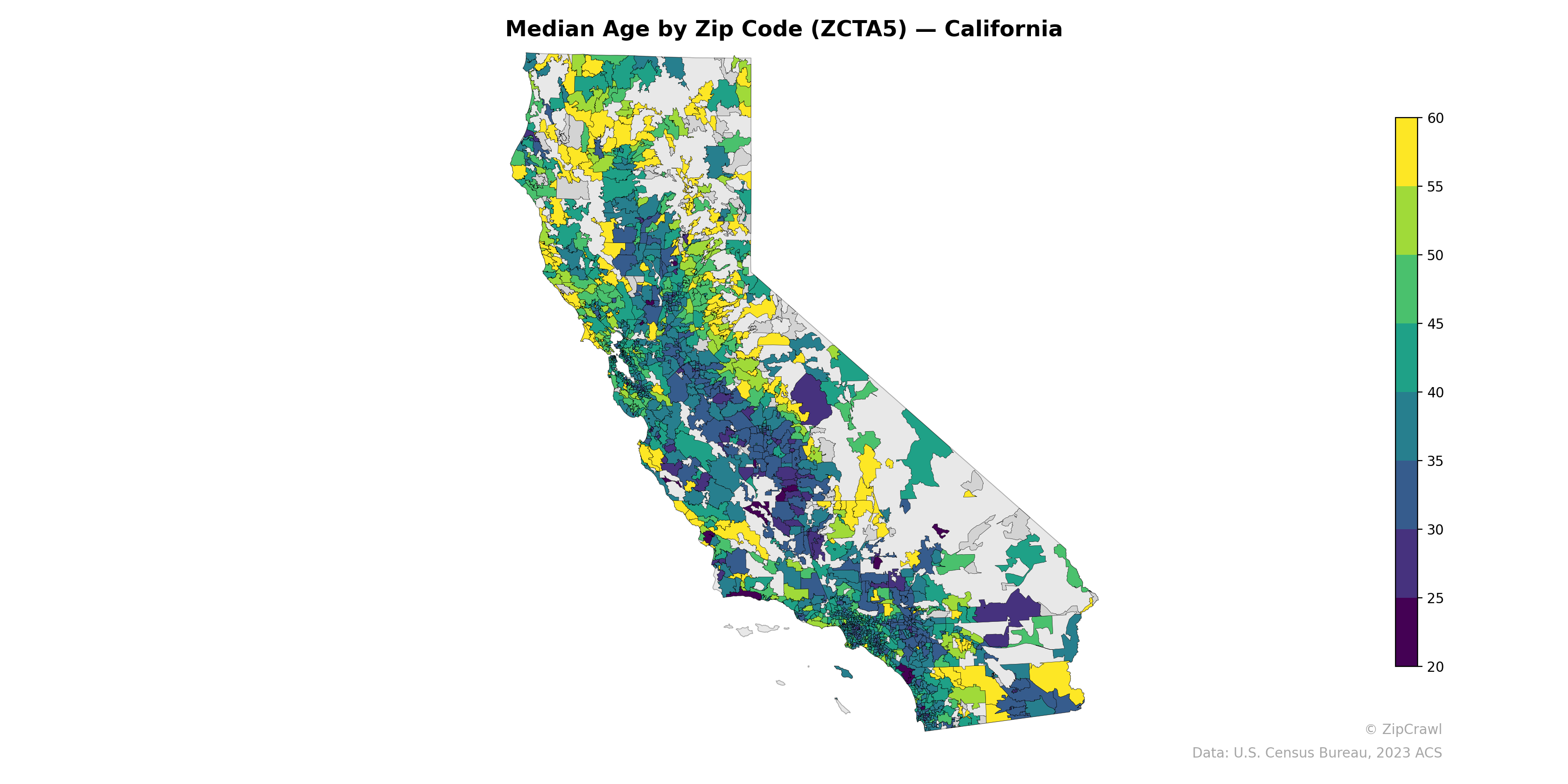 Northern California's rural and coastal counties—particularly along the North Coast and Sierra Nevada foothills—skew notably older with median ages frequently exceeding 50, appearing in yellow and light green tones, while the Central Valley agricultural corridor and dense urban cores of Los Angeles, the Inland Empire, and parts of the Bay Area trend significantly younger, with pockets dipping below 30. The youngest zip codes, shown in deep purple, cluster around university towns and immigrant-heavy urban neighborhoods in Southern California, creating a stark contrast with the retirement-oriented communities along the northern coast. A broad gradient is visible moving from the younger, more diverse southern metro areas northward into the less populated, older-skewing mountain and rural regions of the state.