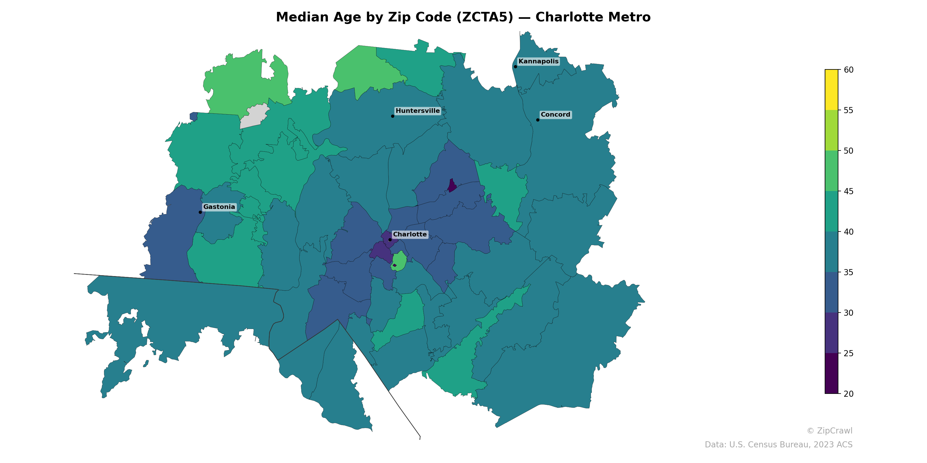 The Charlotte metro area exhibits a clear age gradient radiating outward from the urban core, where zip codes near downtown Charlotte register median ages in the low-to-mid 20s—likely influenced by college-age populations and young professionals—while surrounding suburban and exurban areas generally fall in the 35–45 range. The northwestern quadrant near Gastonia contains a notable cluster of younger-skewing zip codes with median ages in the upper 20s to low 30s, contrasting with older-leaning areas north of Kannapolis and in the far northern reaches where median ages approach 55–60. A small pocket of distinctly higher median age (approximately 55+) appears in the yellow-green zone just southeast of central Charlotte, suggesting a concentration of older residents amid an otherwise younger urban landscape.