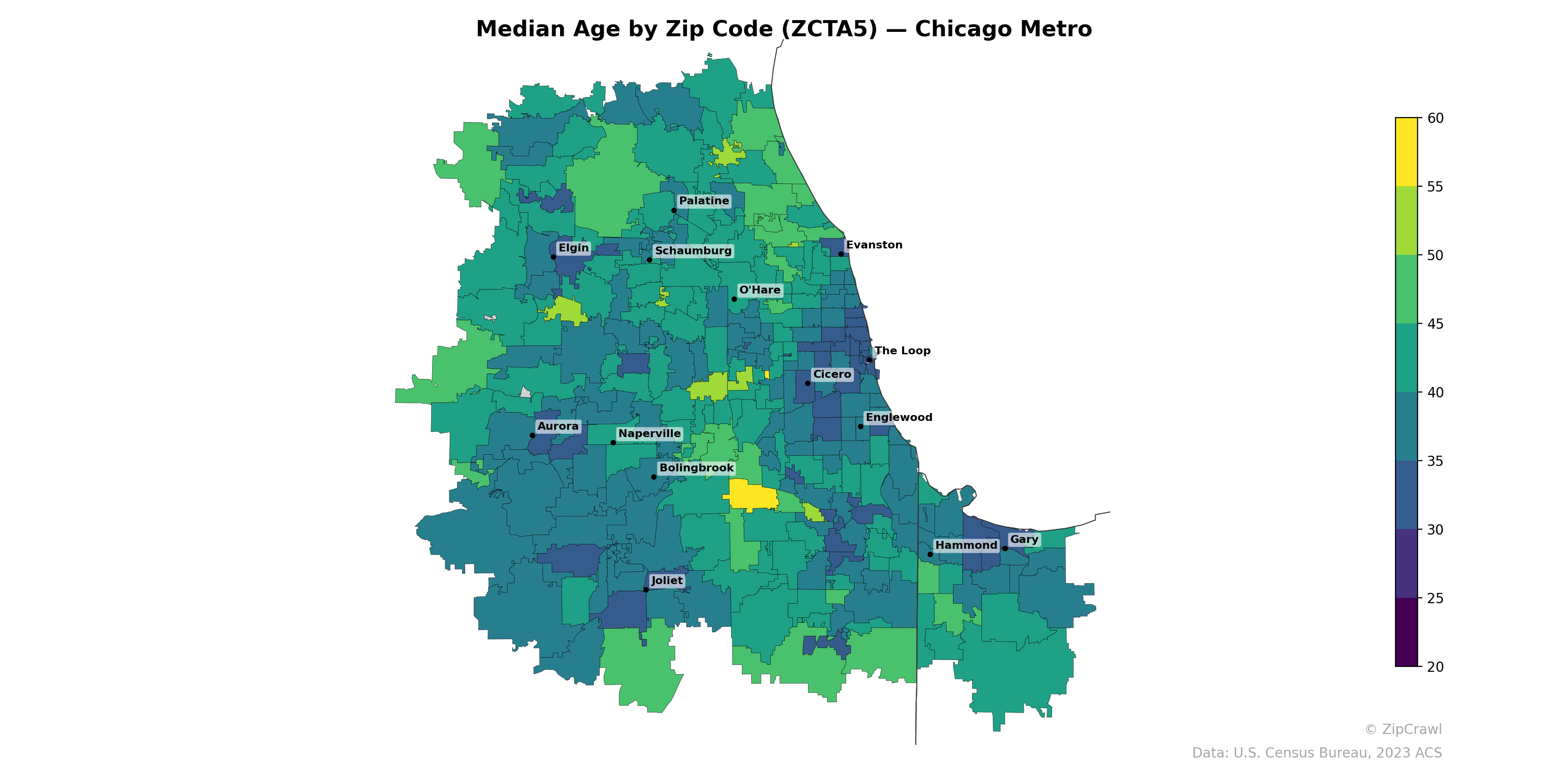 Median age skews youngest in Chicago's South Side neighborhoods around Englewood and in portions of the western suburbs near Aurora and Elgin, where several zip codes fall below 30, likely reflecting younger families and immigrant communities. The oldest-skewing zip codes cluster prominently in the far northern suburbs and along the northern lakefront exurbs, with pockets exceeding 55 years. A notable contrast exists between the consistently younger urban core—particularly The Loop and Near West Side—and the ring of older-median-age communities in the mid-range suburban belt stretching from Naperville through Schaumburg to Palatine.