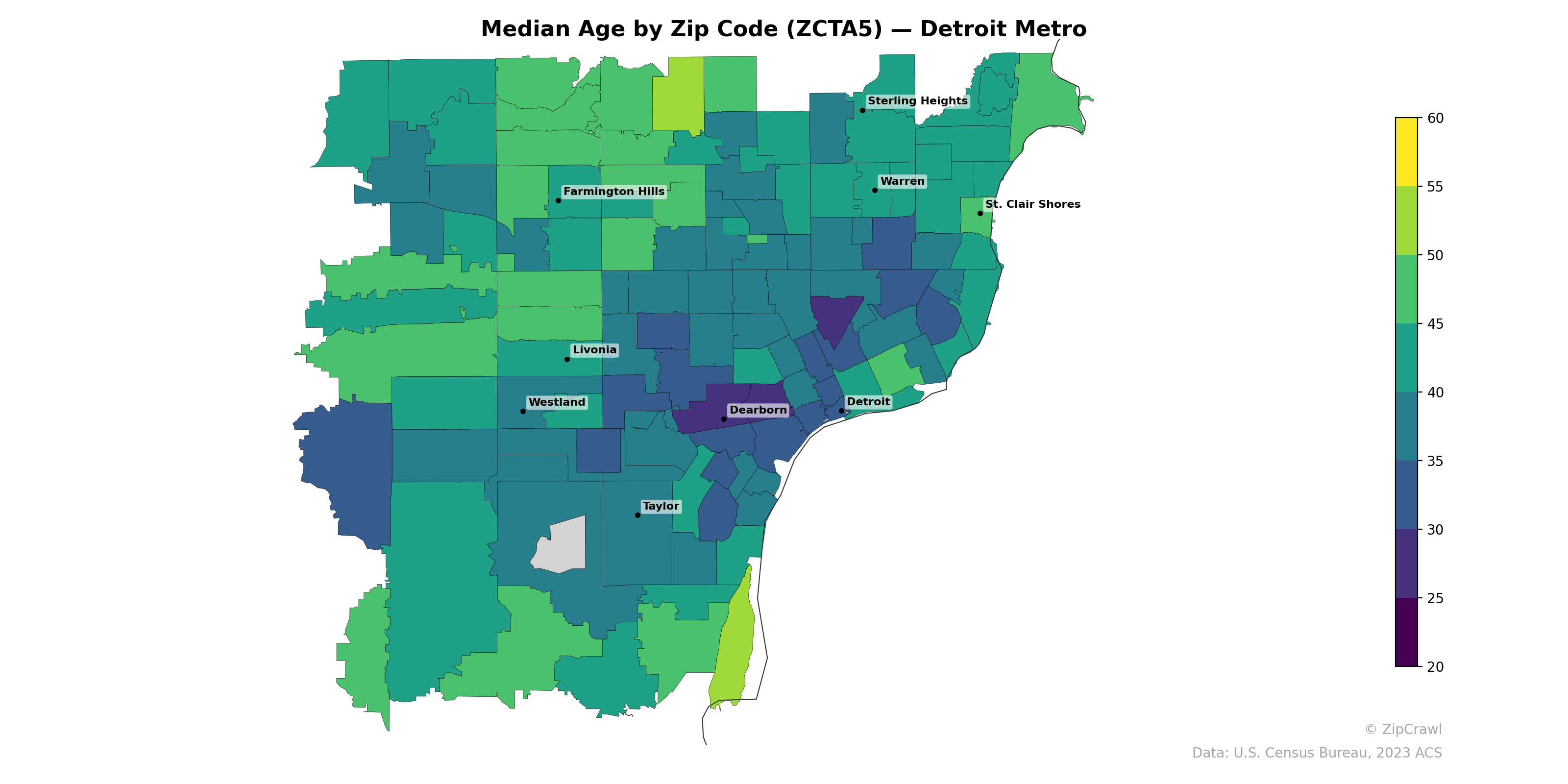The Detroit city center and its immediate surrounding zip codes exhibit notably lower median ages, predominantly in the 20–30 range, reflecting a younger urban population, while suburban communities such as Livonia, Farmington Hills, and Sterling Heights trend considerably older with median ages in the mid-40s to upper 50s. A particularly striking cluster of the youngest zip codes (under 25) appears in the Dearborn and southwest Detroit area, likely corresponding to neighborhoods with larger immigrant families and younger household compositions. The northwestern suburbs display the highest median ages, with several zip codes reaching into the upper 50s and low 60s, suggesting established, aging-in-place communities with lower turnover.