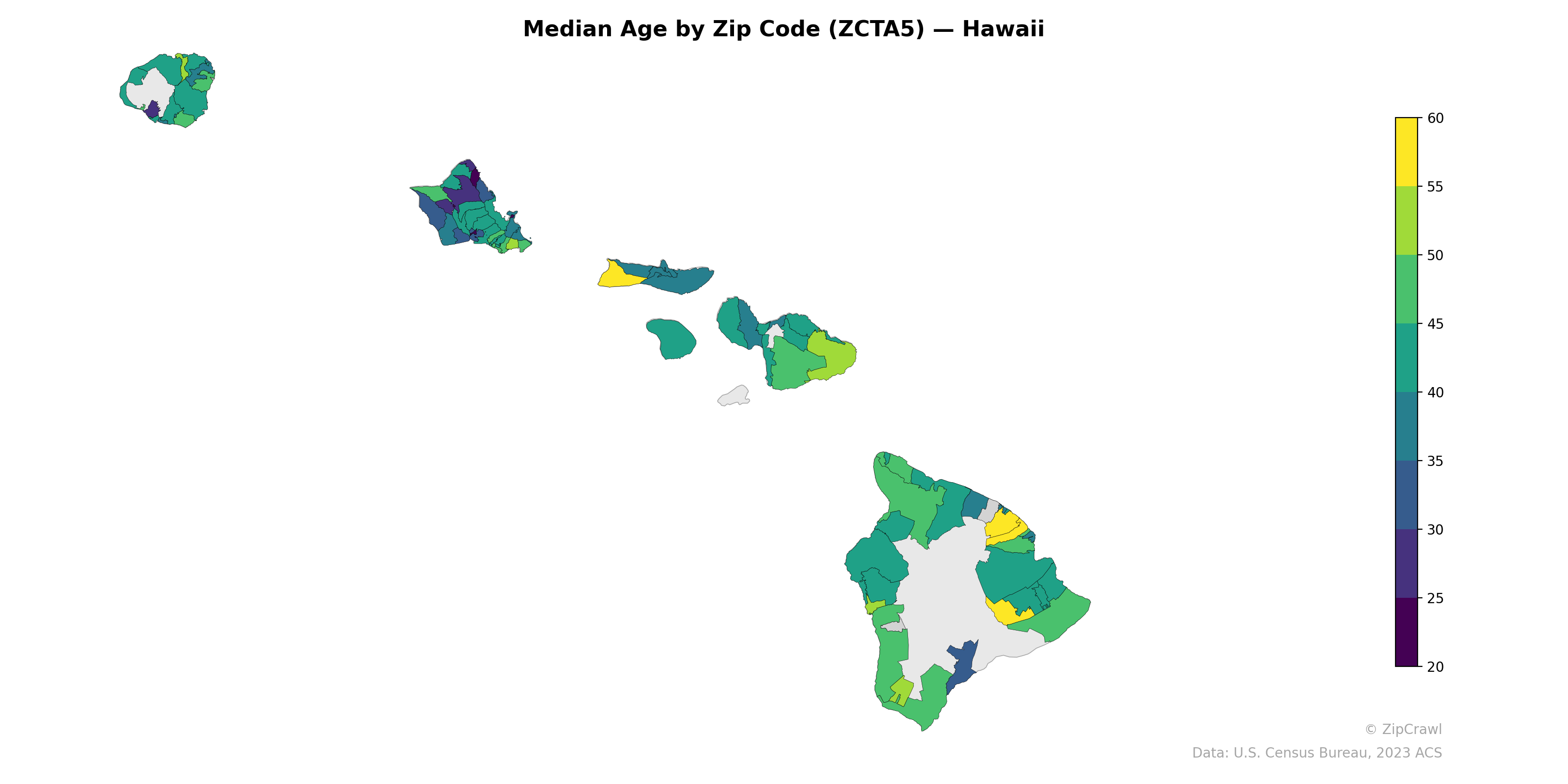 The Big Island exhibits the widest intra-island variation, with several zip codes along the southern Kona and Ka'u coast dipping into the low-to-mid 20s—likely reflecting younger military or student populations—while adjacent areas in the resort-heavy western coast trend toward the upper 50s and into the 60s. Kauai's north shore and interior zip codes skew notably older (50+), contrasting with younger pockets on O'ahu's urban core near Honolulu. Maui displays a moderate gradient, with older median ages concentrated in the resort-heavy southern and western coastal areas and younger populations in the central valley communities.