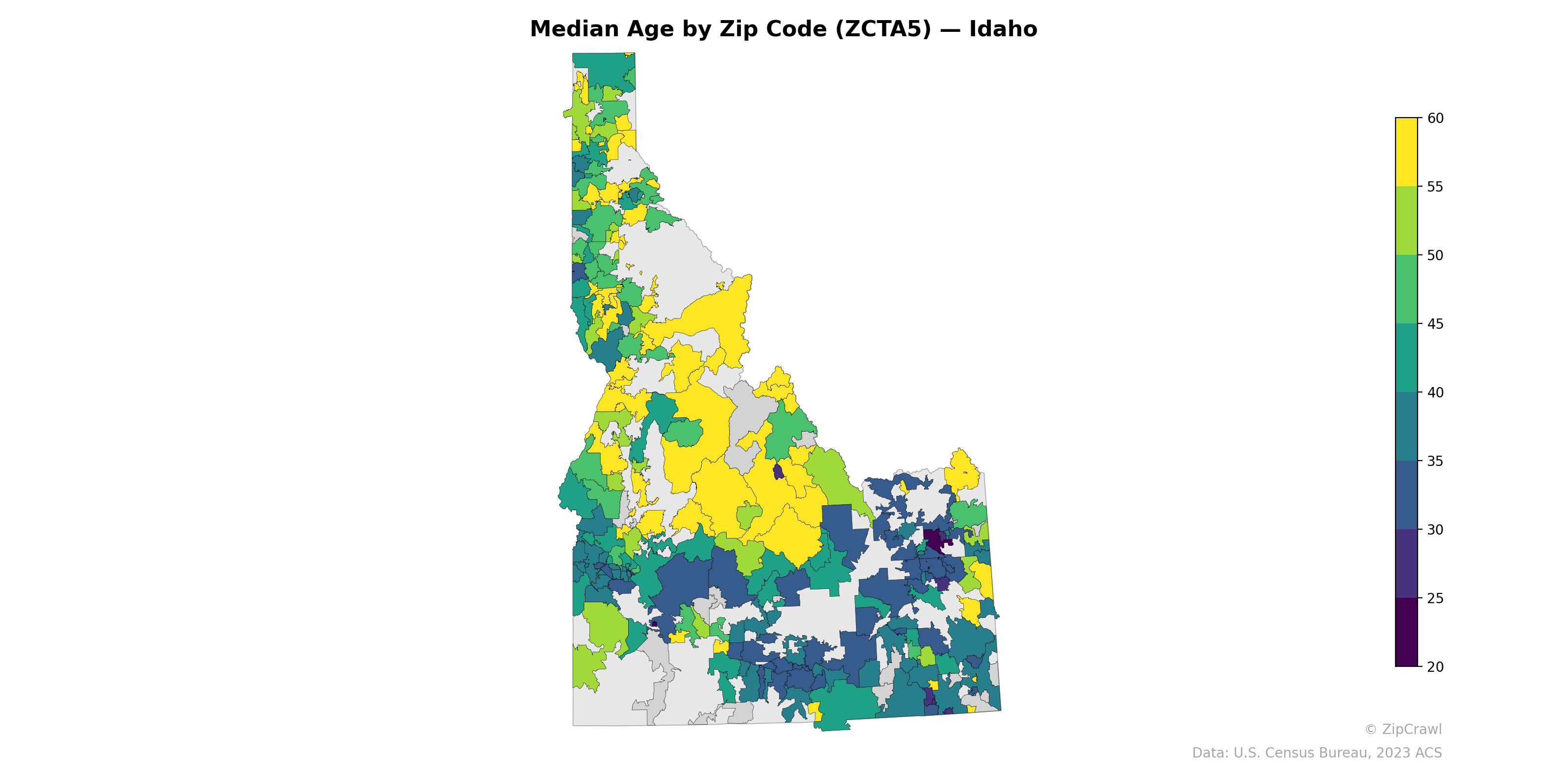 Central Idaho's large rural zip codes display consistently high median ages in the 50–60 range, forming a prominent yellow band stretching from the Salmon River region through the upper Snake River Plain. The northern panhandle and western border areas near Boise trend younger, with median ages generally in the 30s and 40s, reflecting more urbanized and growing populations. A striking cluster of very low median ages (under 25) appears in the southeastern corner near Rexburg—home to Brigham Young University–Idaho—contrasting sharply with the surrounding older-skewing agricultural communities.
