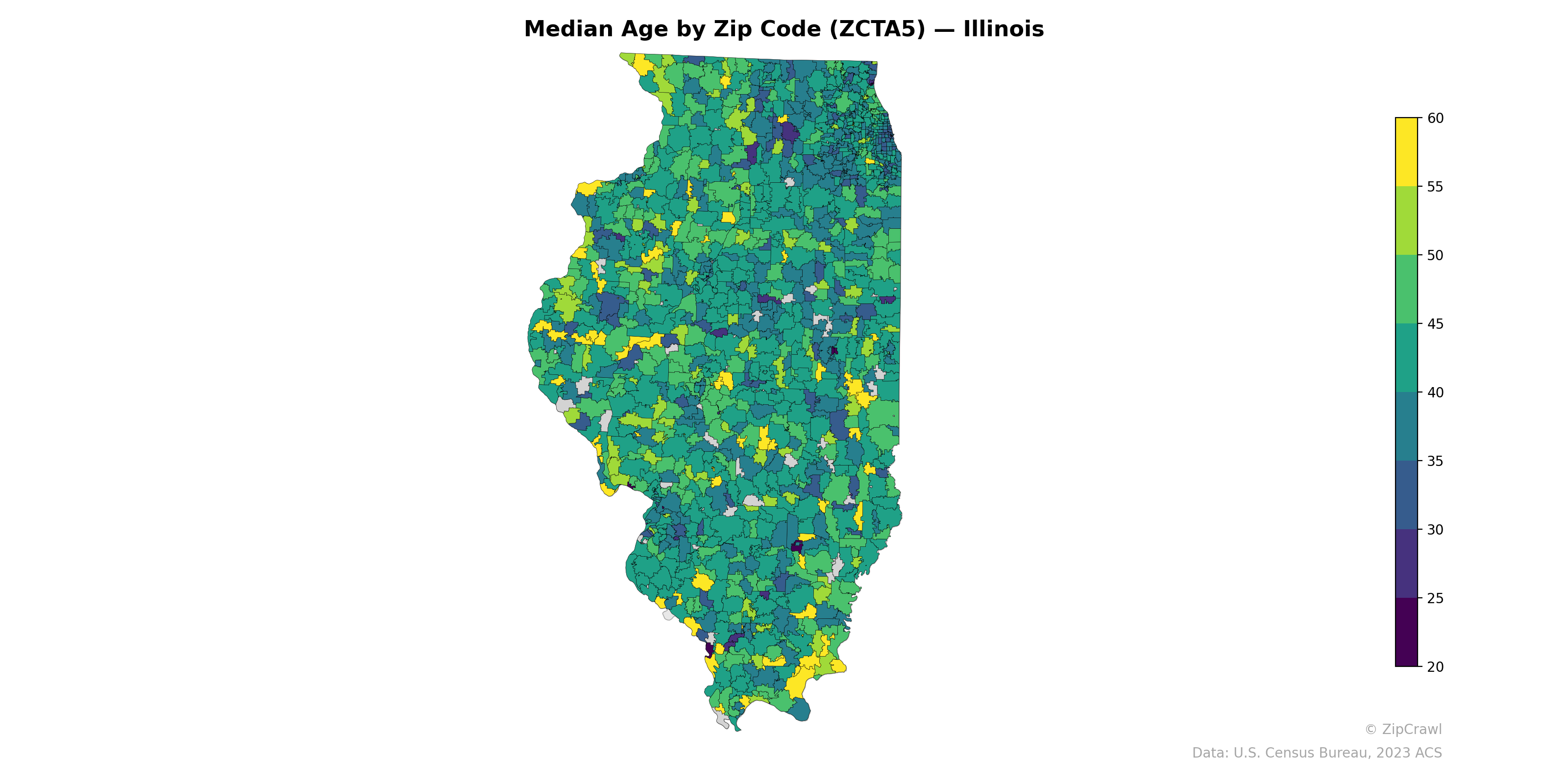 The Chicago metropolitan area in northeastern Illinois displays significant internal variation, with pockets of very low median ages (under 30) in dense urban zip codes contrasting sharply against affluent suburban communities trending into the mid-40s to 50s. Rural zip codes across central and western Illinois generally skew older, with numerous scattered yellow-shaded areas indicating median ages above 55, likely reflecting small agricultural communities experiencing youth outmigration. The southern tip of the state near Cairo stands out with notably dark shading suggesting some of the youngest median ages in the state, potentially driven by institutional populations or distinct demographic compositions.