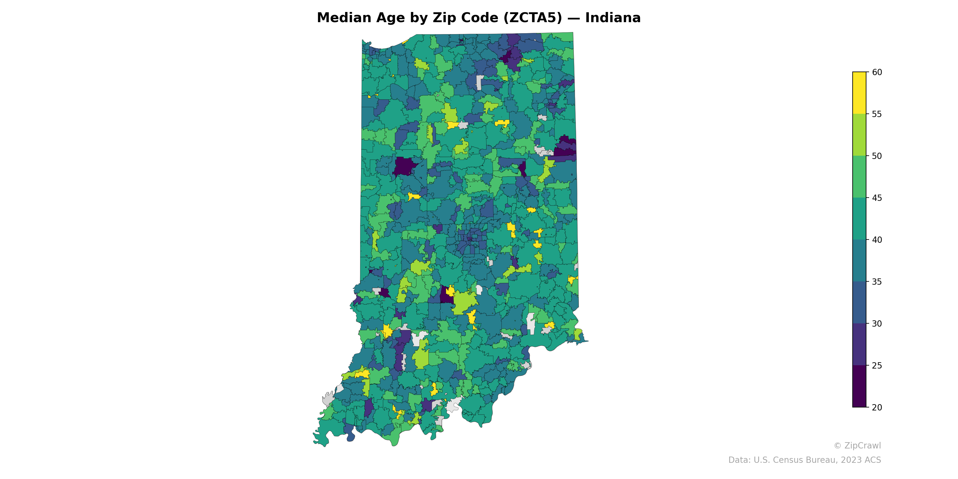 Zip codes in the southern third of Indiana, particularly in the southwestern and south-central regions, tend to skew older with median ages frequently reaching 50–60+, appearing as prominent yellow-green clusters. The Indianapolis metropolitan area and college towns such as Bloomington (south-central) and West Lafayette (northwest-central) stand out as distinctly younger pockets, with deep purple and dark teal tones indicating median ages in the low 20s to mid-30s. Northern Indiana displays a more heterogeneous pattern, with moderate median ages in the 35–45 range interspersed with isolated older and younger outliers, particularly around the Fort Wayne and South Bend urban corridors.