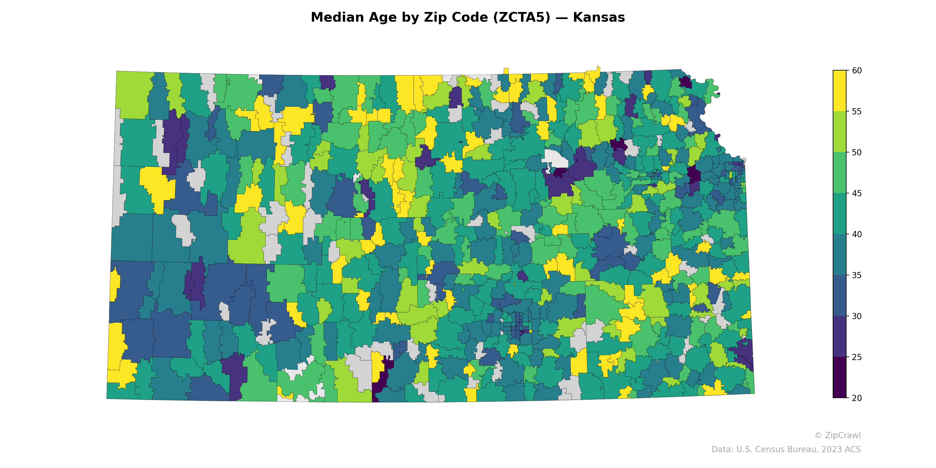 Zip codes in the northeast corner of Kansas—particularly in the Kansas City metro and surrounding Johnson and Wyandotte county areas—display a wide range of median ages, with some younger pockets in the low 30s adjacent to areas exceeding 50, reflecting the demographic diversity of suburban and urban communities. The youngest median ages, dropping below 25, appear in scattered zip codes likely corresponding to college towns such as Manhattan (Kansas State) and Lawrence (University of Kansas) in the east-central and northeast portions of the state. Western and central Kansas zip codes trend notably older, with large swaths in the 50–60+ range interspersed with yellow-highlighted areas, suggesting aging rural populations punctuated by small towns that may attract or retain younger residents.