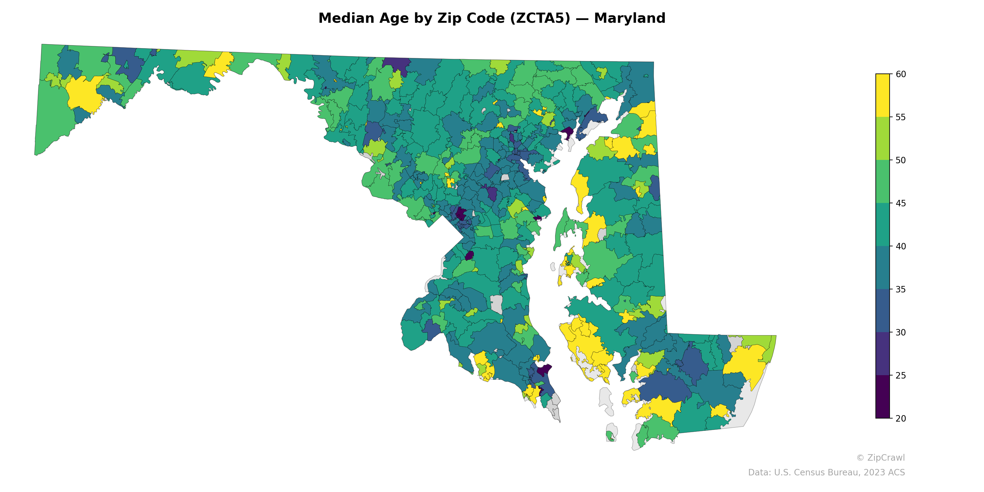 The Eastern Shore and southern Maryland coastal areas display notable age polarization, with several zip codes reaching median ages above 55 alongside pockets dropping below 25, likely reflecting retirement communities adjacent to college towns or military installations. The central corridor spanning the Baltimore–Washington suburban belt clusters predominantly in the 35–45 range, consistent with younger working-age families in these high-density metro areas. Western Maryland's panhandle skews older overall, with scattered yellow-shaded zip codes exceeding 50, though a few notably younger pockets—particularly around the Frostburg/Cumberland area—suggest the influence of university populations.