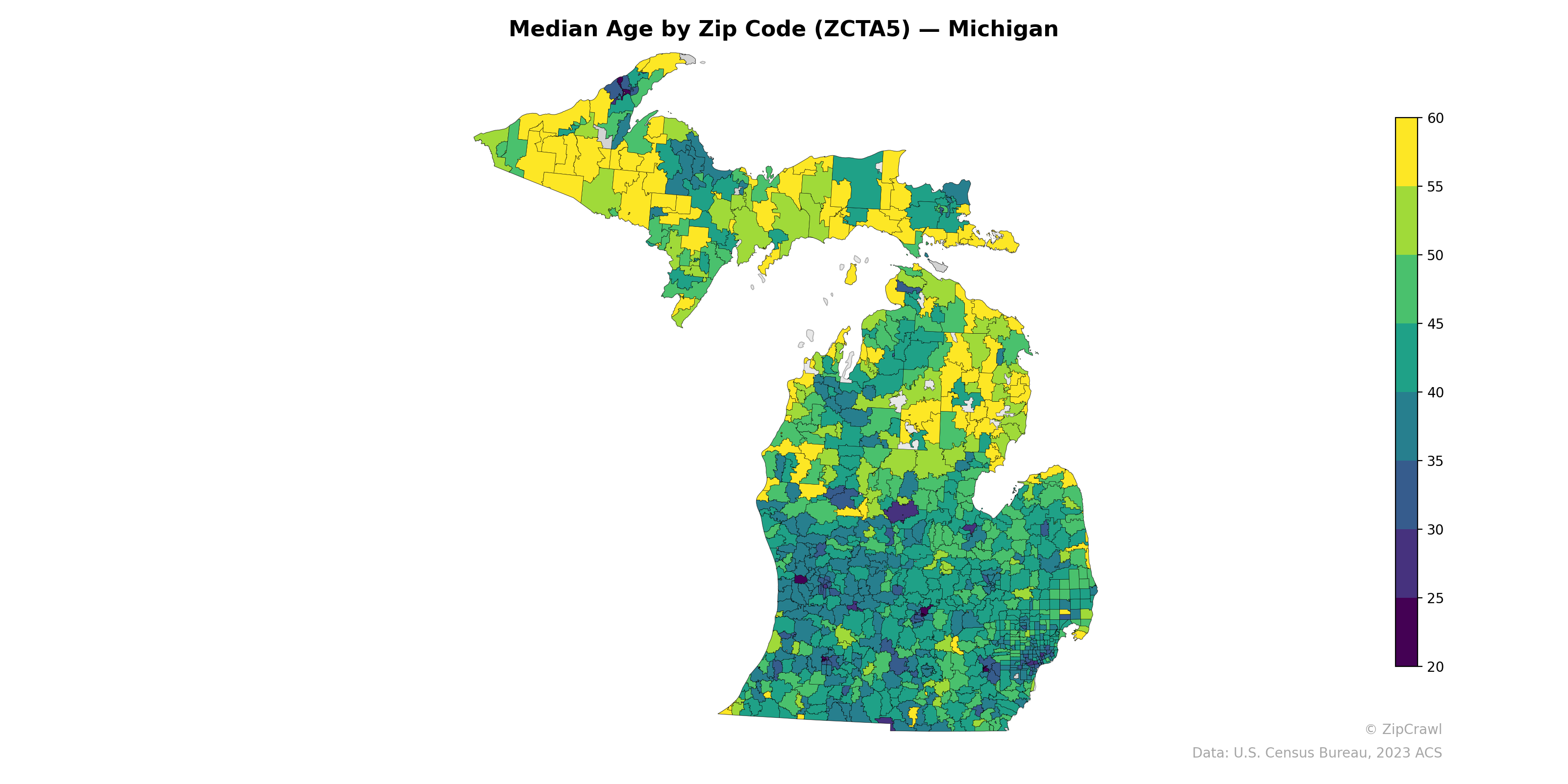 Northern Lower Michigan and much of the Upper Peninsula skew older, with numerous zip codes reaching median ages of 55–60+, reflecting the prevalence of retirement and resort communities in areas like the Traverse City region and along the Lake Michigan coastline. The southeastern metro Detroit area and mid-state university towns such as East Lansing and Ann Arbor form distinct clusters of younger median ages, dropping below 25–30 in some zip codes. The Lower Peninsula's southern tier generally maintains moderate median ages in the 35–45 range, with pockets of younger populations concentrated around urban cores and older populations in surrounding exurban and rural areas.